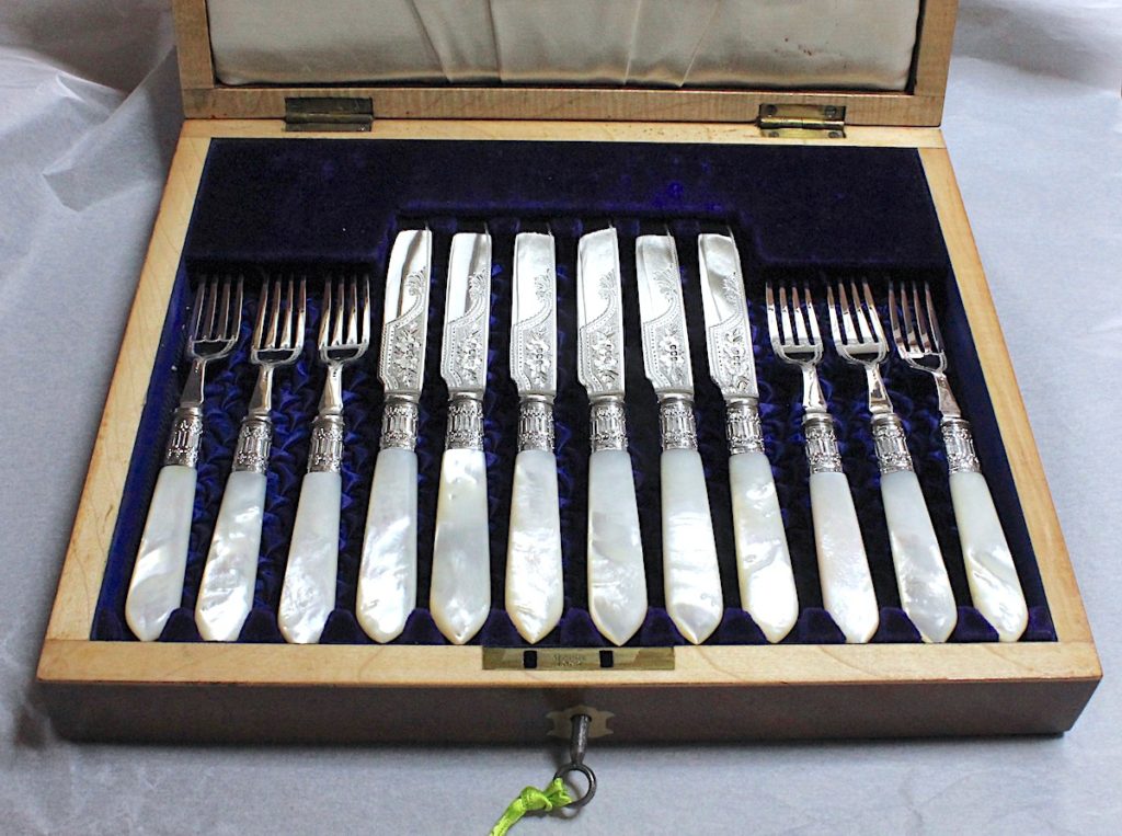 白蝶貝のデザートセットは6人用で箱入り。鍵がついていて、きちんと動作します。
