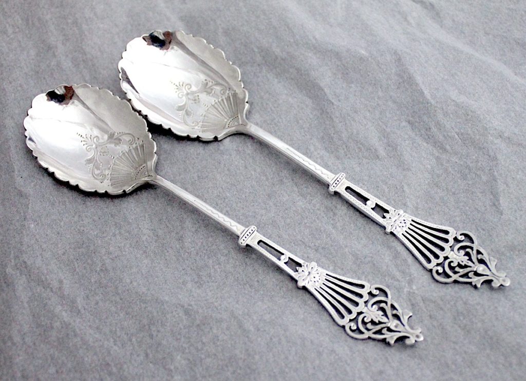 *リボンとお花装飾のナイフレストは、ベルギーシルバーです。James Dixon& Sonsの美しいピアスジャムスプーン、にスコップ型キャディスプーン。