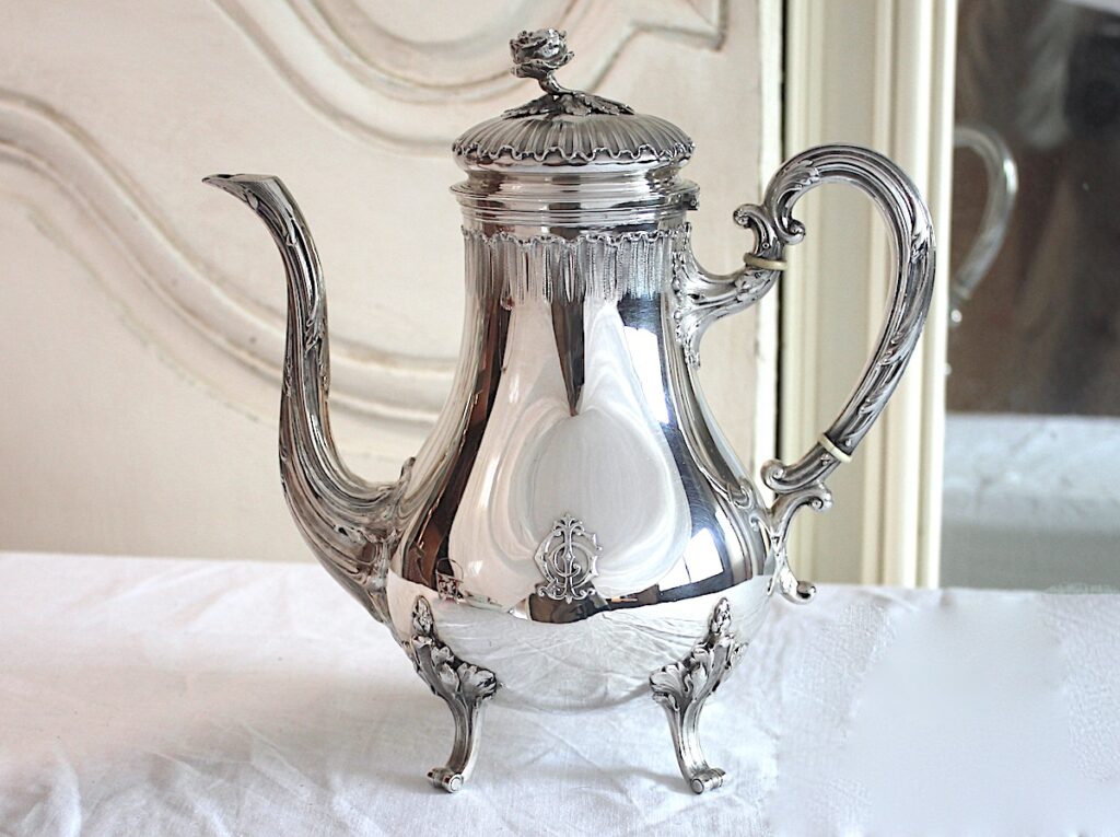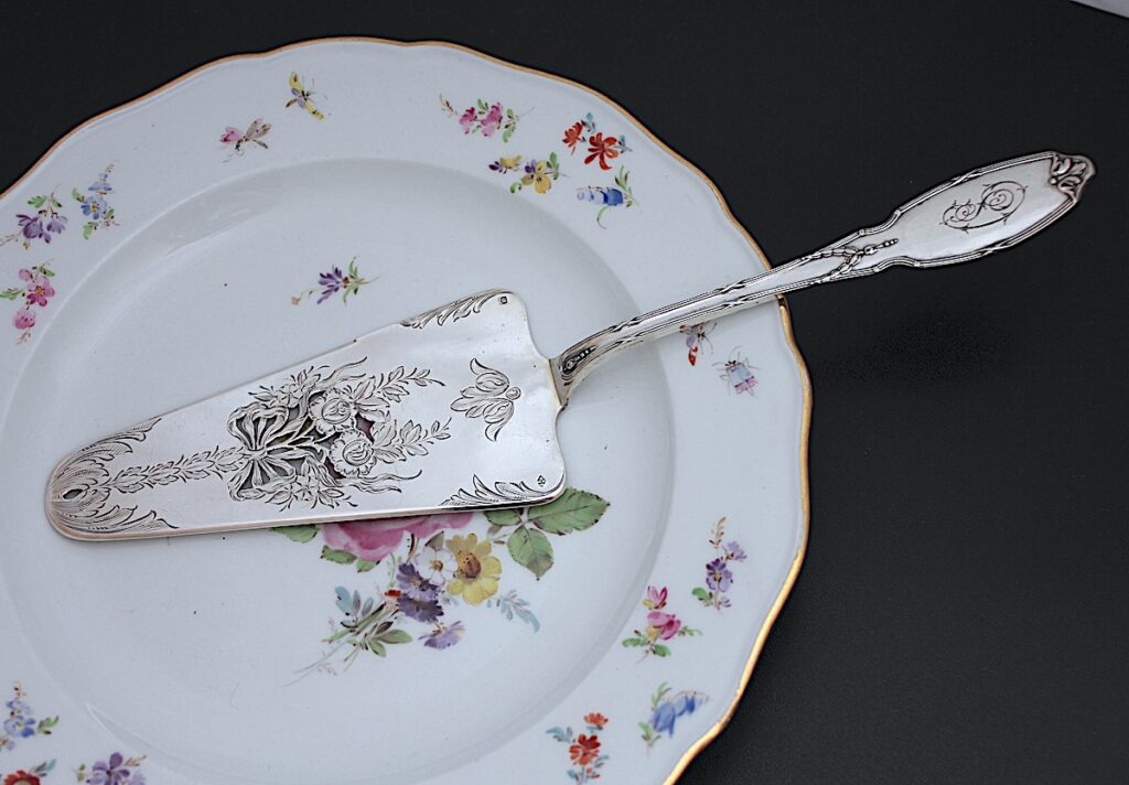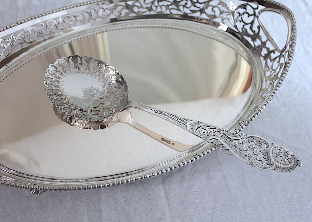 ピアスのサービングスプーン、白蝶貝のデザートセット、フレンチシルバーのコーヒーポット、ピアスのトレー、リボン柄のサーバーの5点です。ゆっくりご覧ください。