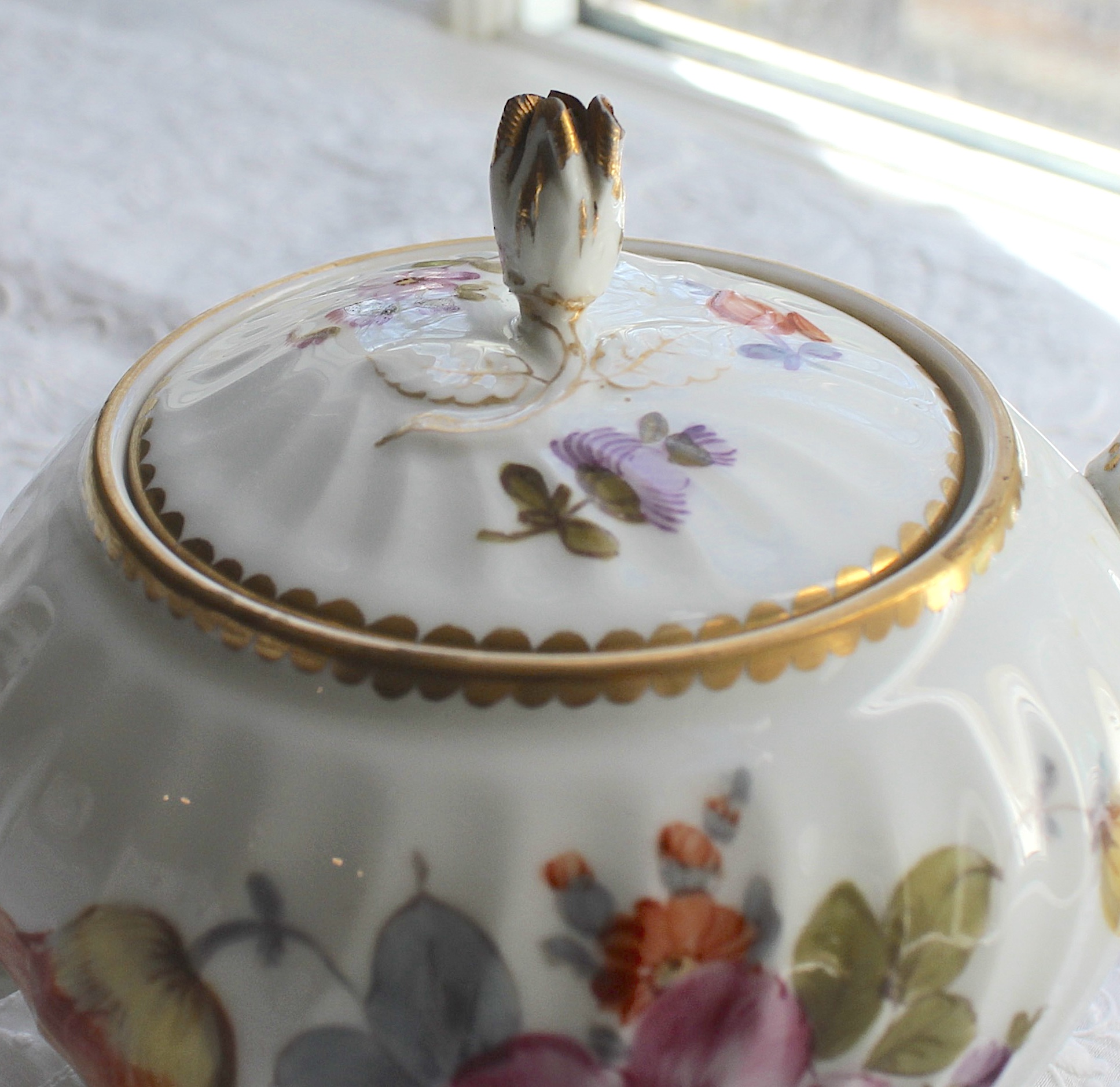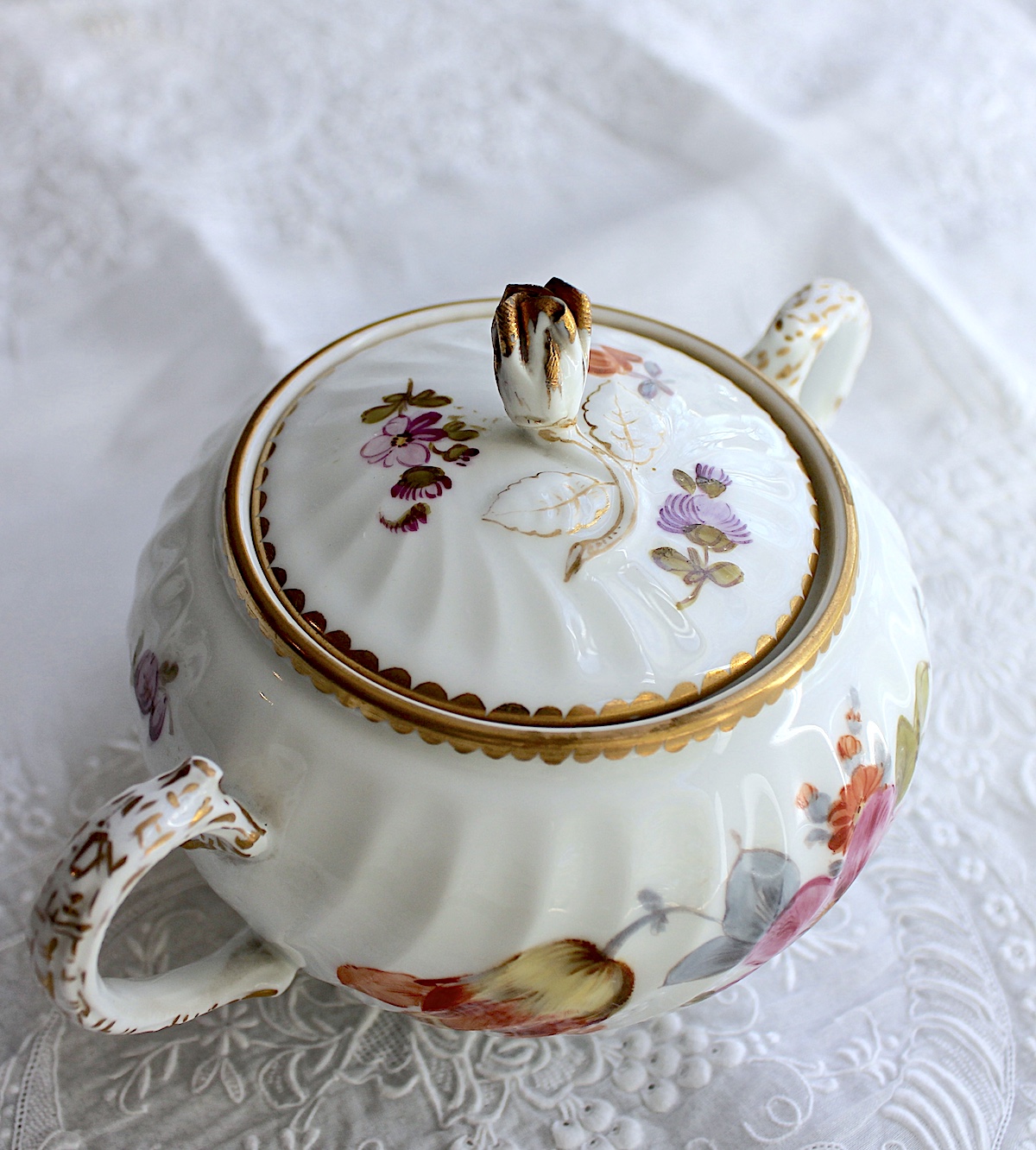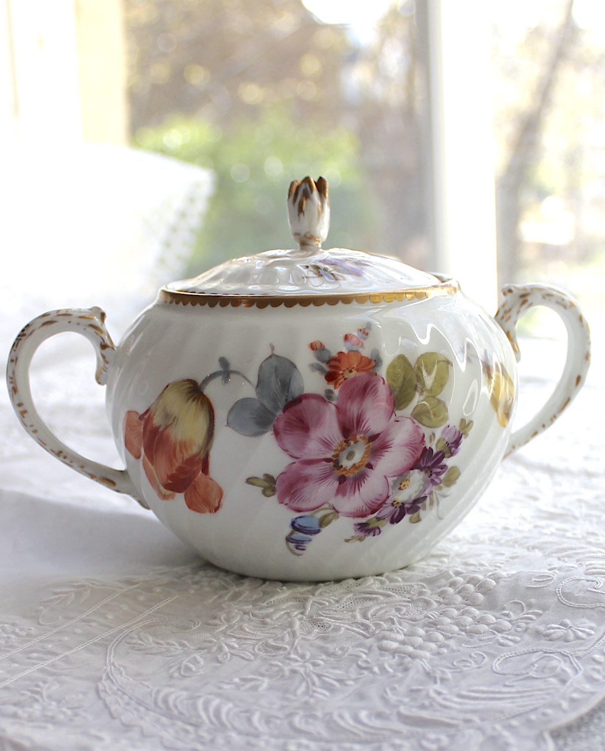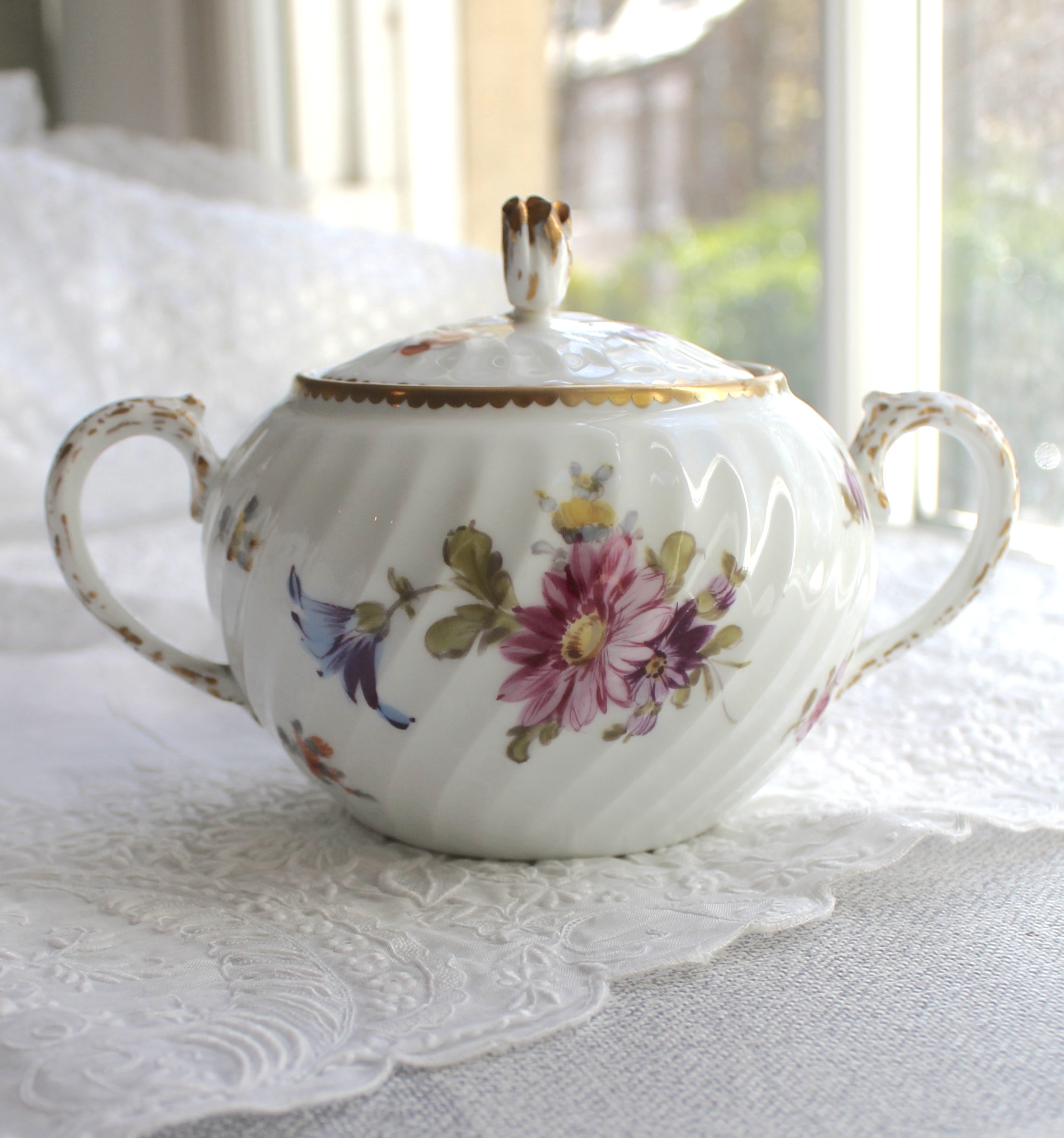 ドイツ、ニンフェンブルグの美しくチャーミングなシュガーボウルをご紹介します。美しい頑丈な白磁に、野の花々が、熟練の優れたハンドペイントで描かれています。