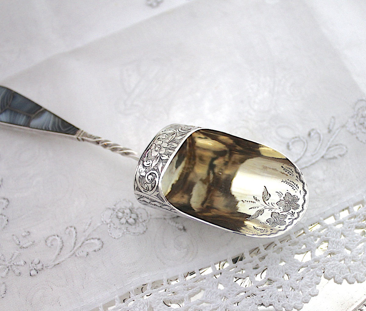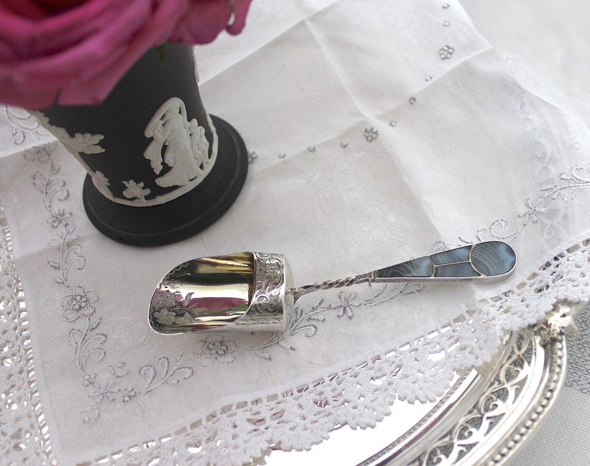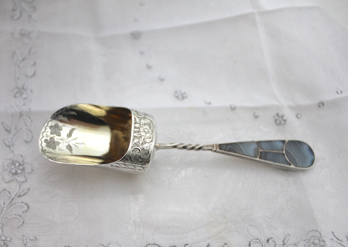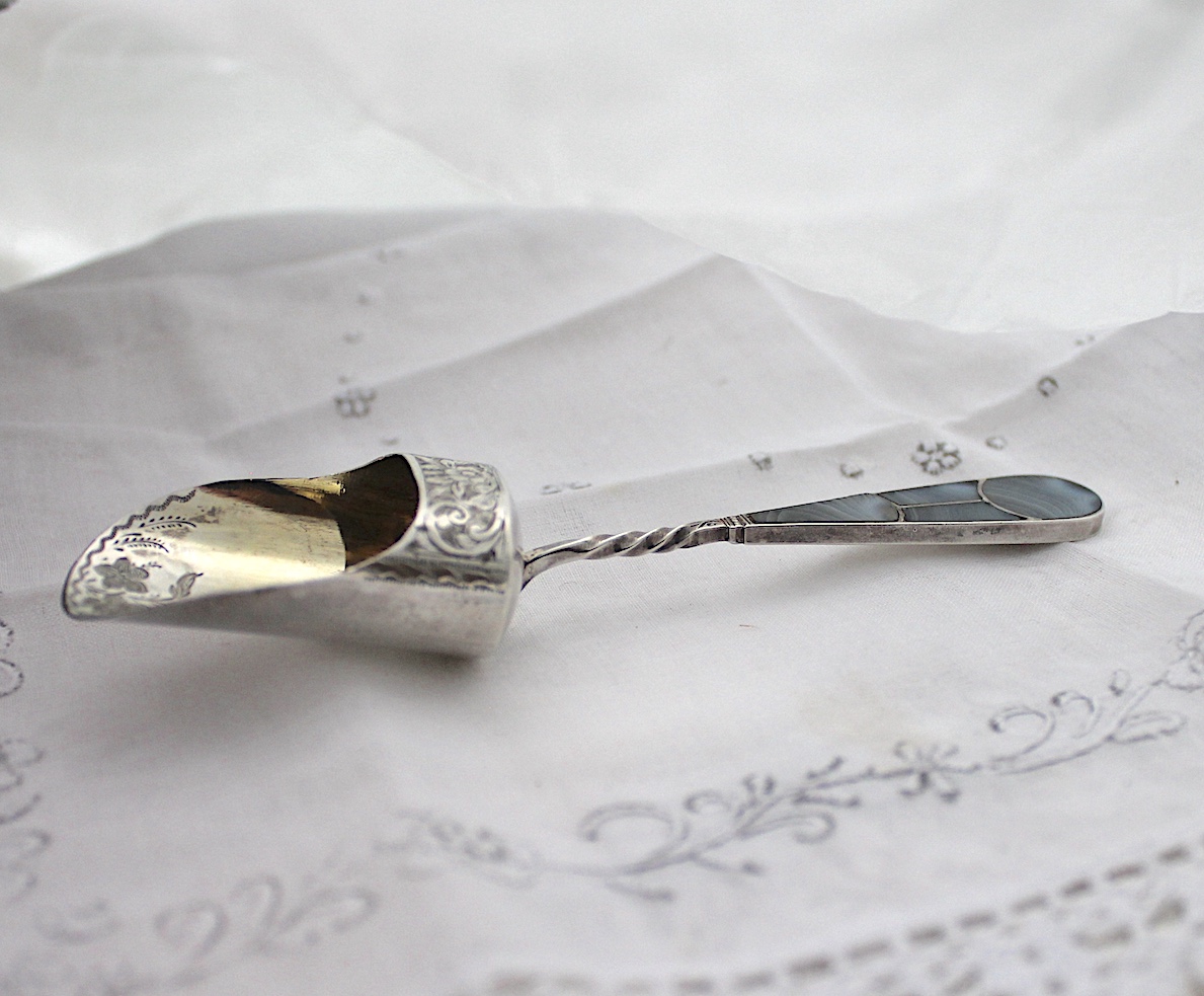 大変レアな、アゲートハンドルのキャディースプーンです。縞模様のあるアゲート(めのう)がいくつかに分かれて、ハンドルに嵌め込まれています。ボウル部分は、ゴールドメッキが施され、さらに茶葉を救う部分には、花柄のエングレビングが施されています。