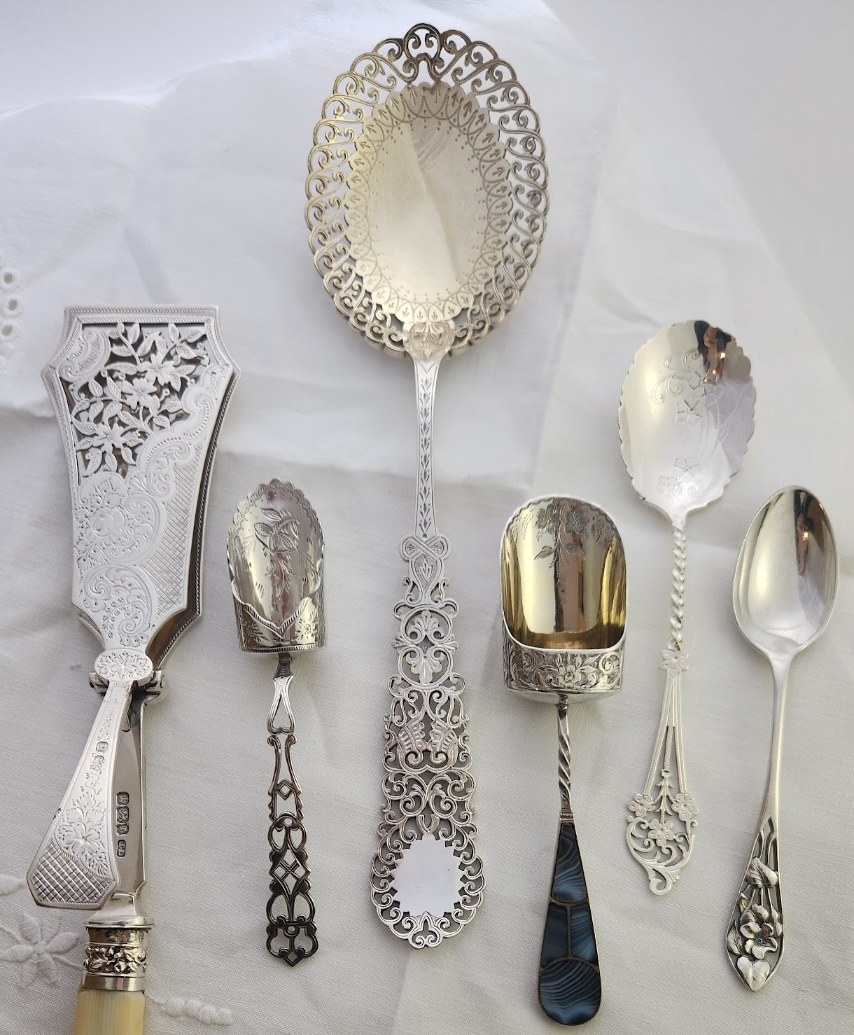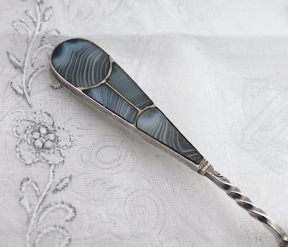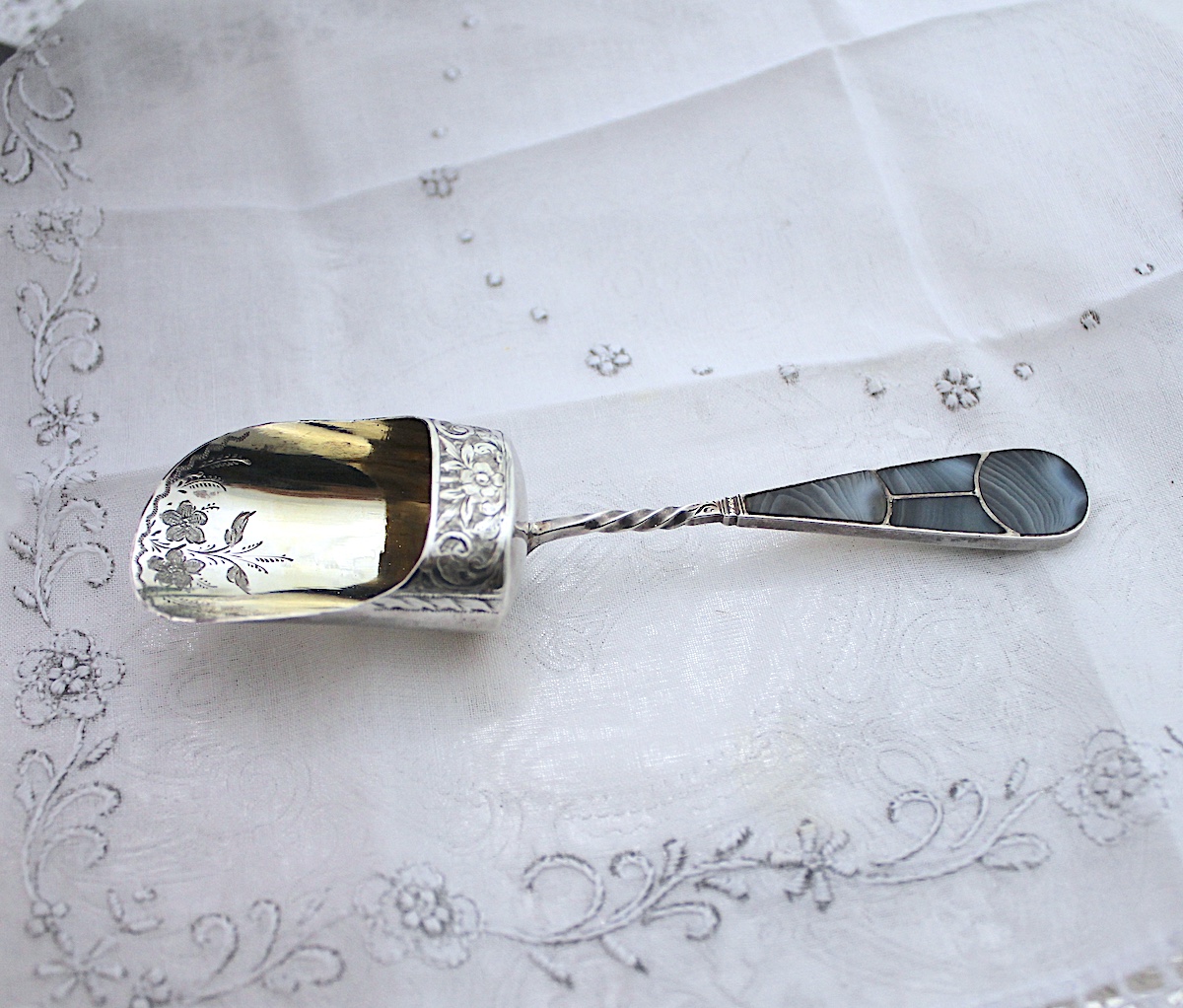 大変レアな、アゲートハンドルのキャディースプーンです。縞模様のあるアゲート(めのう)がいくつかに分かれて、ハンドルに嵌め込まれています。ボウル部分は、ゴールドメッキが施され、さらに茶葉を救う部分には、花柄のエングレビングが施されています。