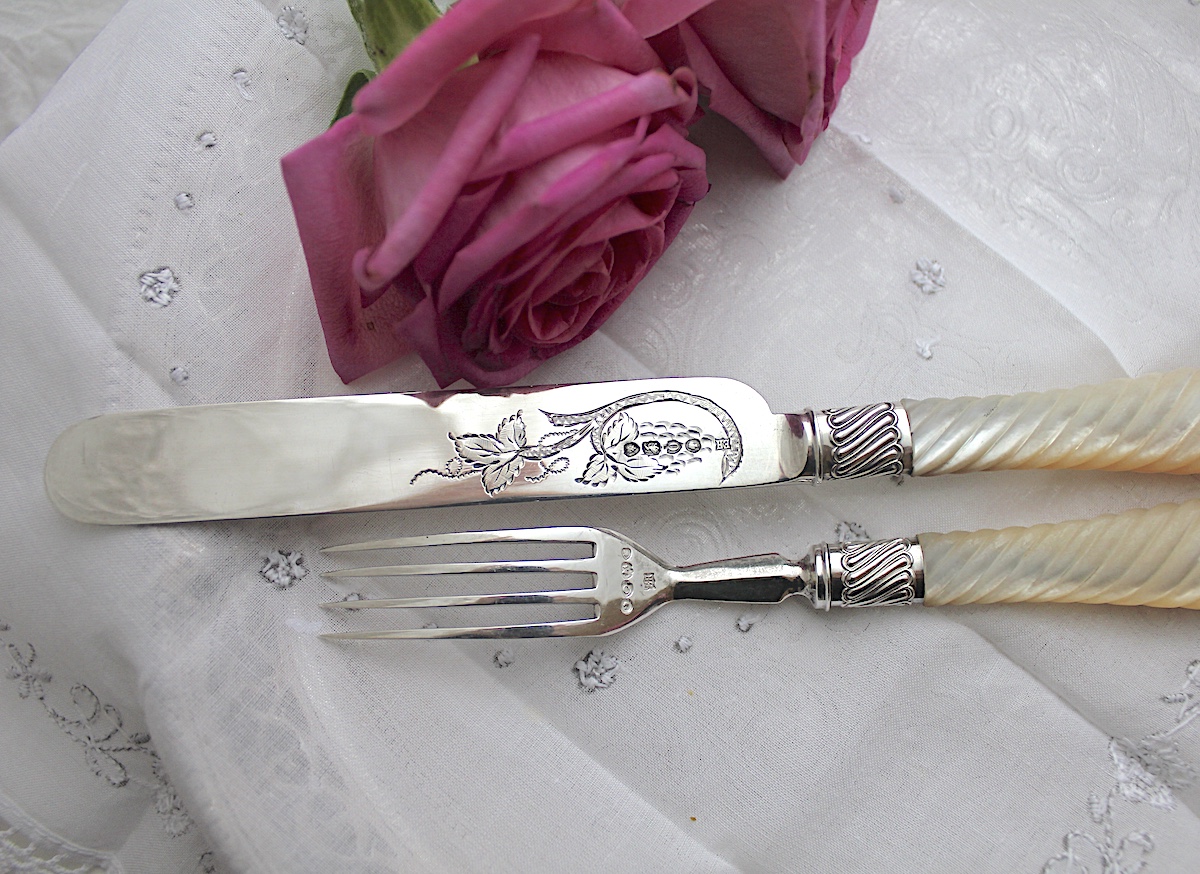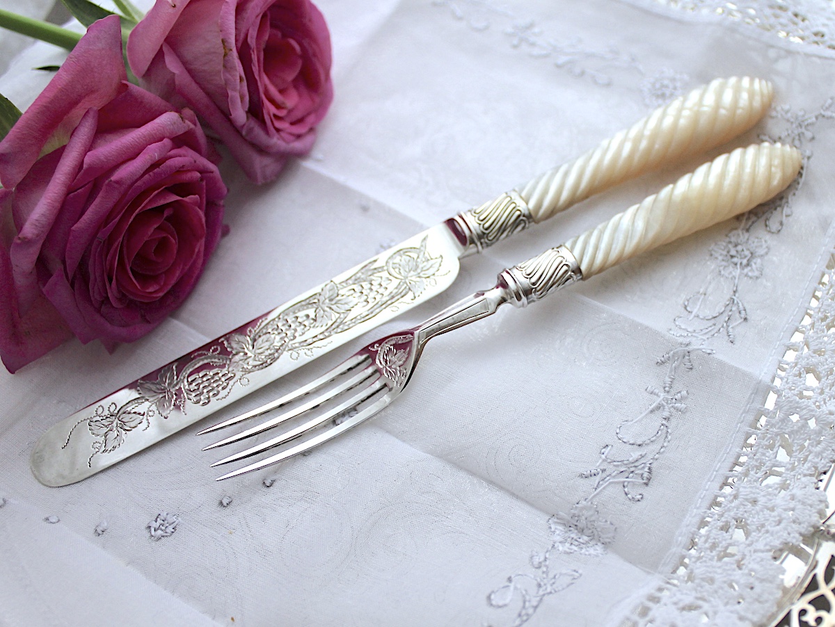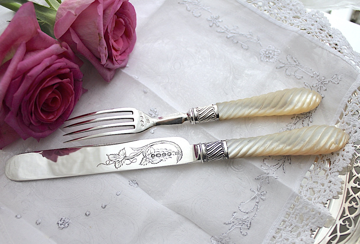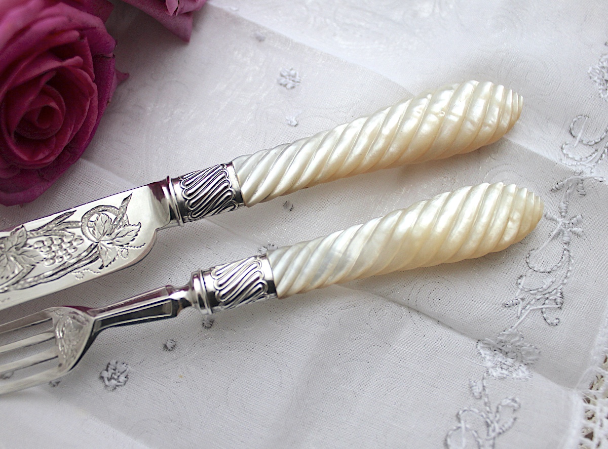 たっぷりした厚みある上質な白蝶貝はミルク色に内側から輝き、ナイフはラウンドブレードと、どれをとっても、一目でわかるビクトリア時代特有の豊かなデザインです。