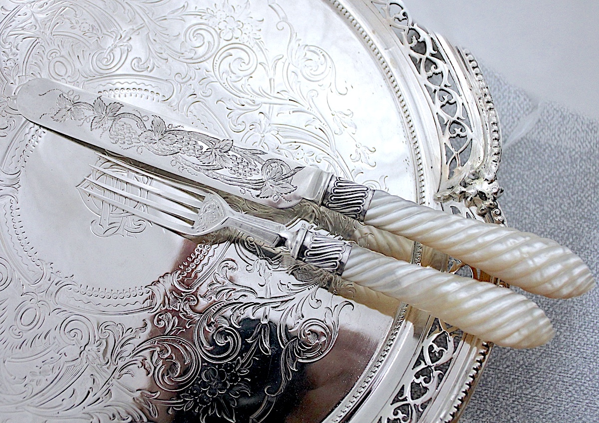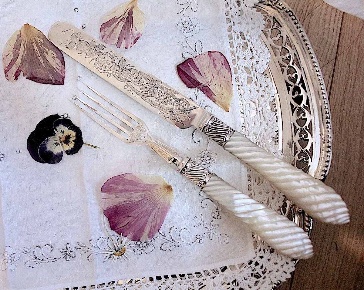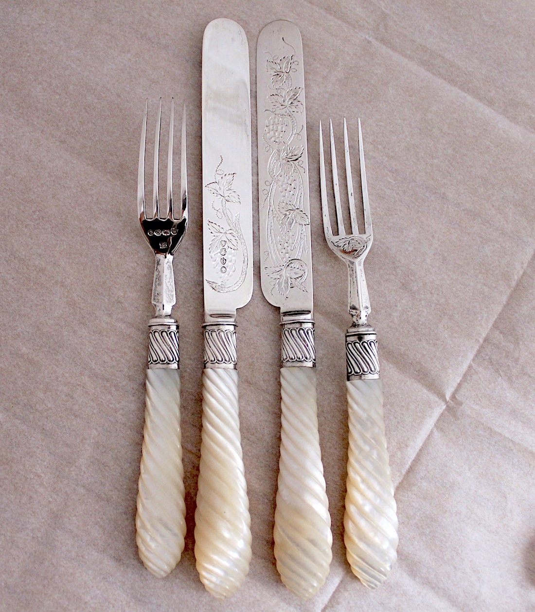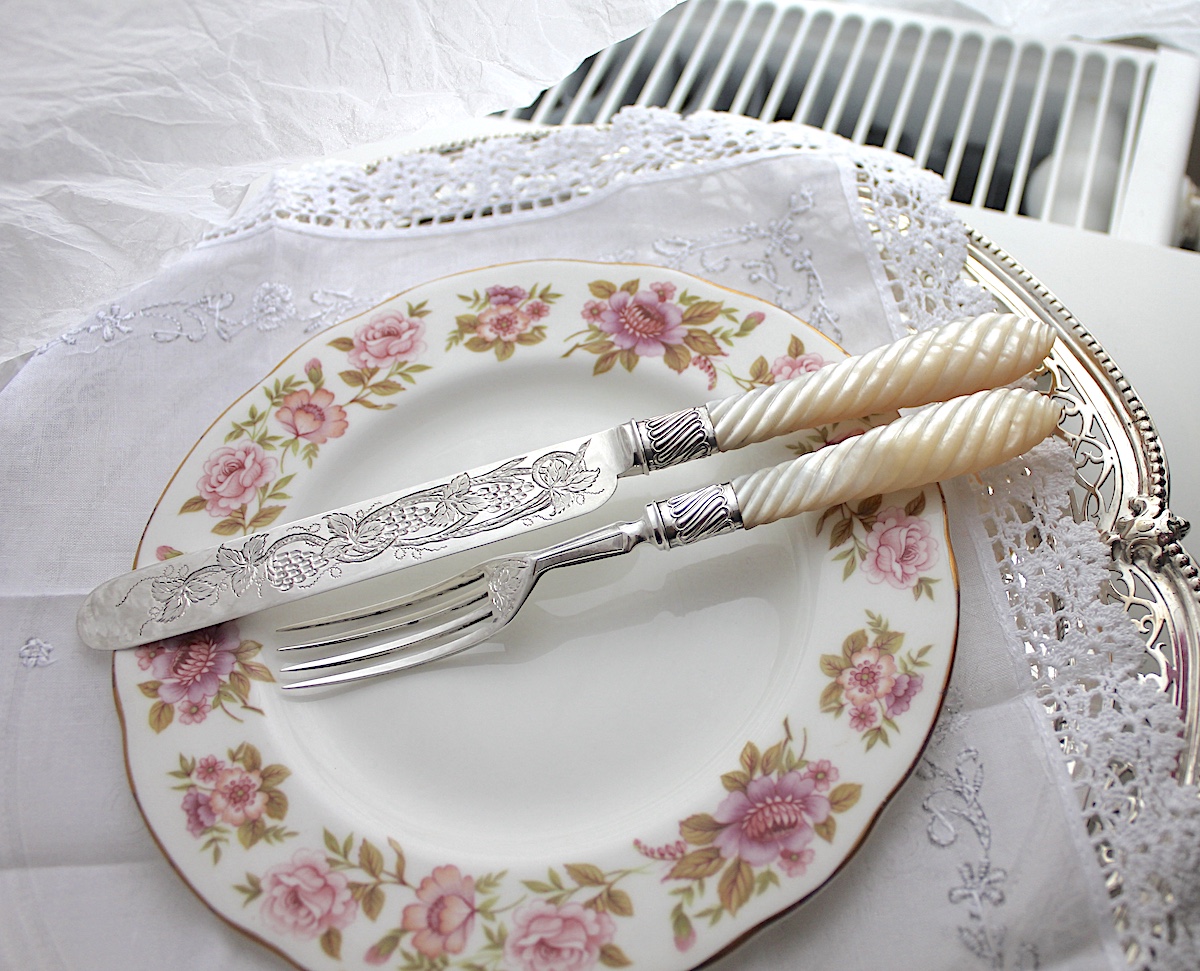 たっぷりした厚みある上質な白蝶貝はミルク色に内側から輝き、ナイフはラウンドブレードと、どれをとっても、一目でわかるビクトリア時代特有の豊かなデザインです。