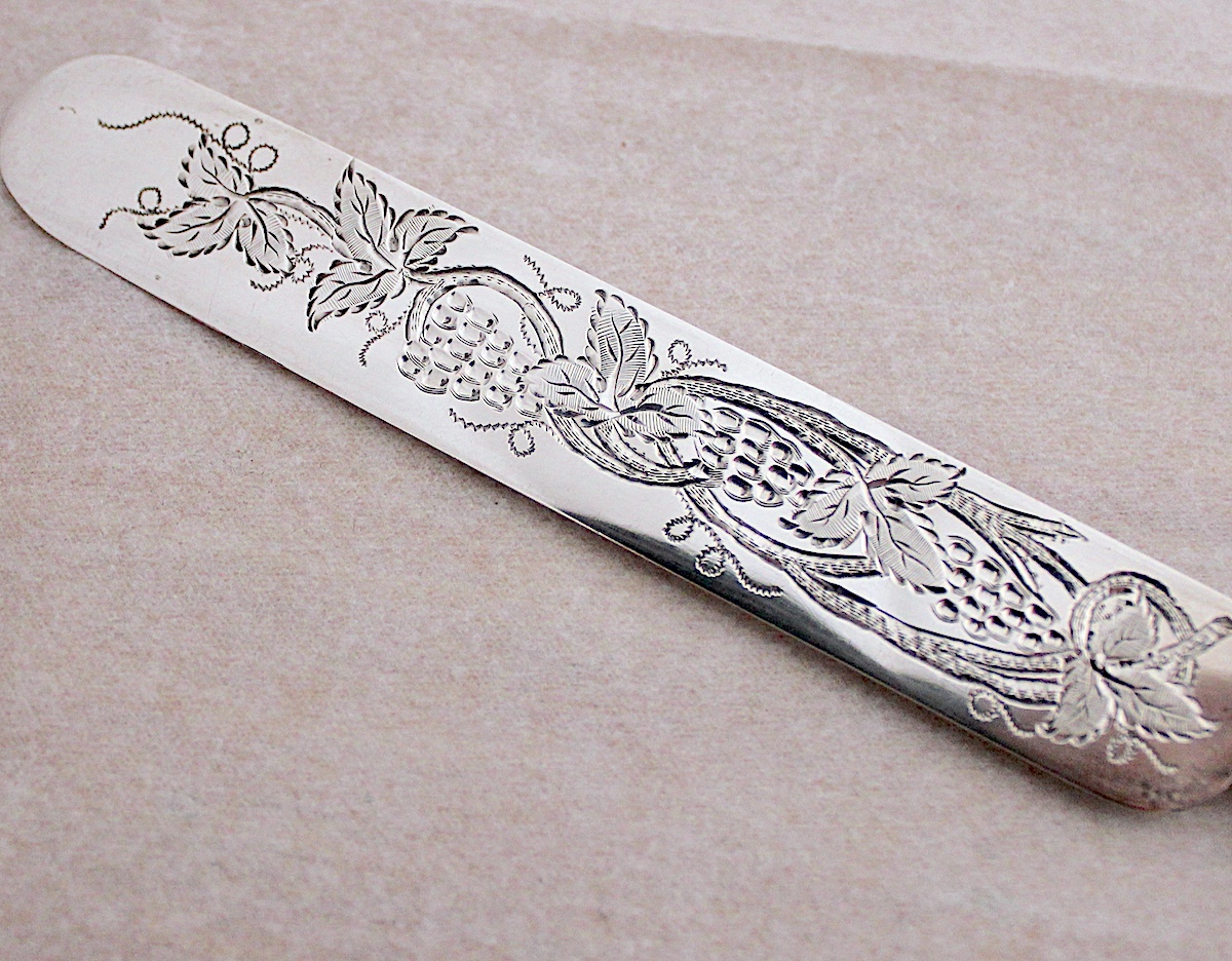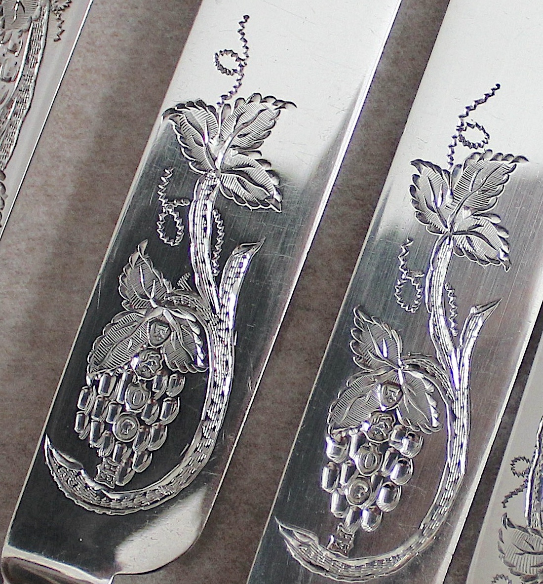 表面には、エングレービングでブドウのデザインがグイグイ彫り込まれ、ハンドルの白蝶貝には、ねじりのデザインが彫刻されています。ねじりデザインは、どこまでも続いていく、終わりがなく栄える、という象徴でもあり、当時は大変好まれたデザインです。