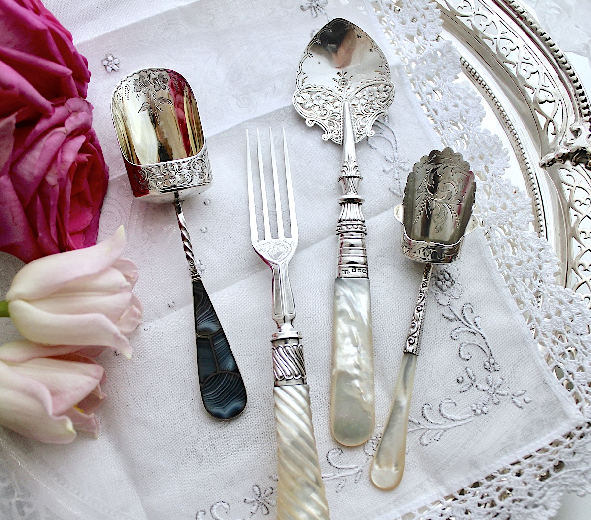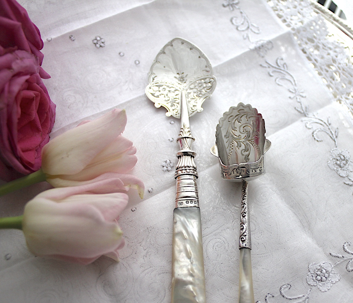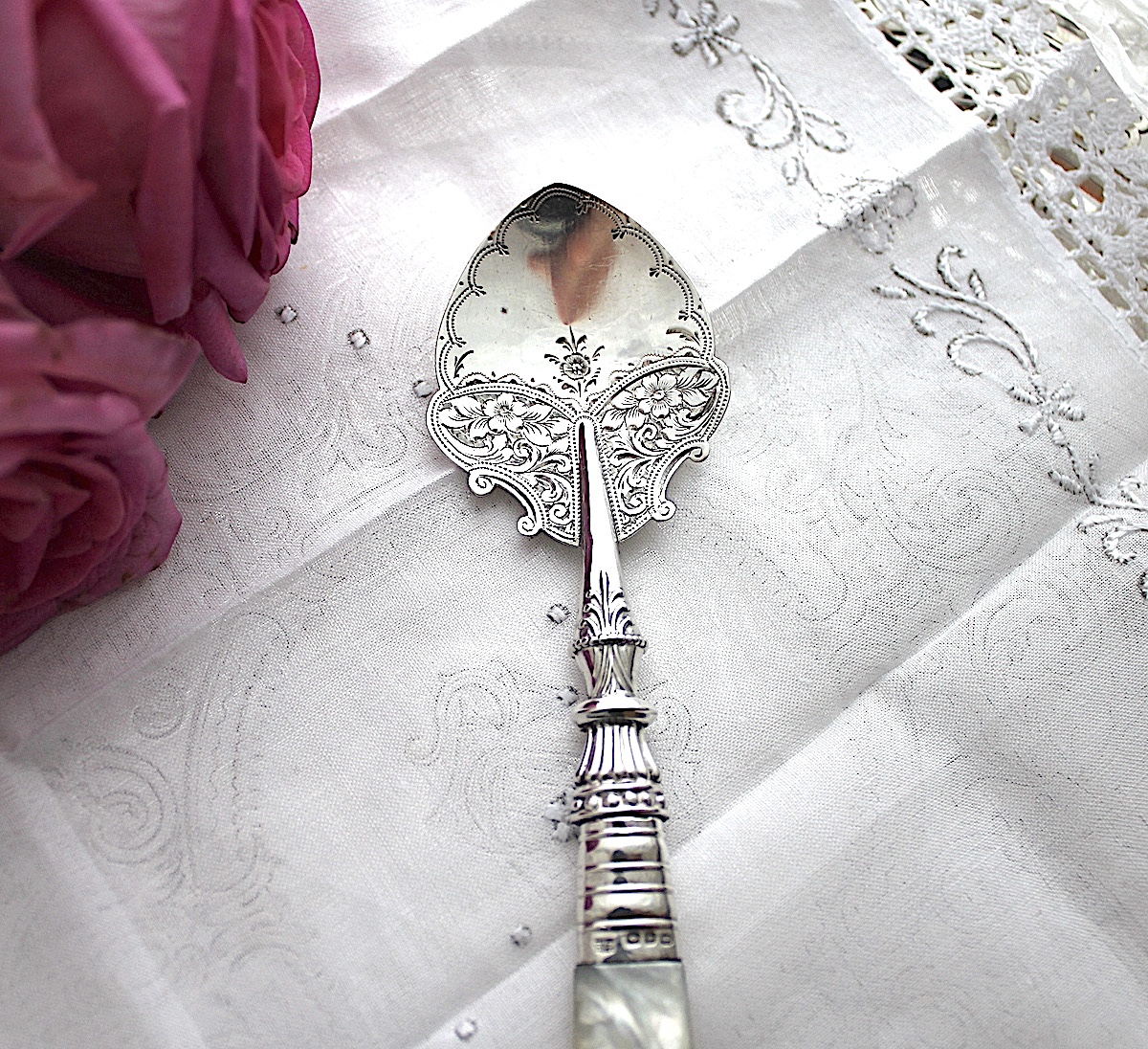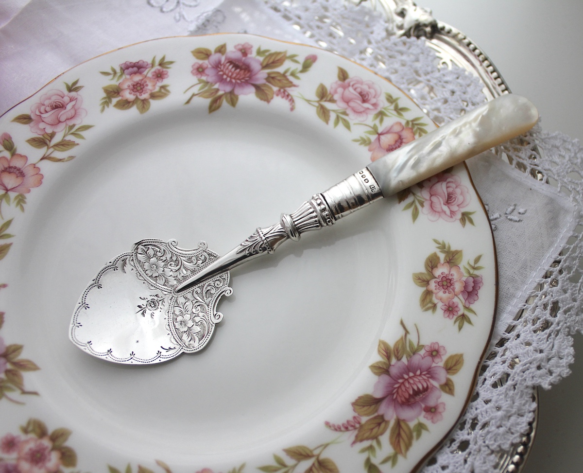 ジャムスプーンは、シンプルな作りのものが多いのですが、白蝶貝のハンドルに、凝った作りのつなぎめデザイン、そしてエレガントでキュートな花柄。