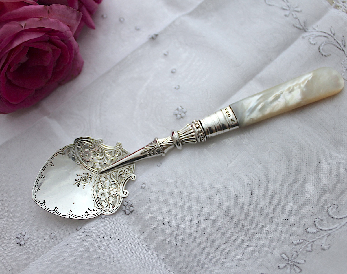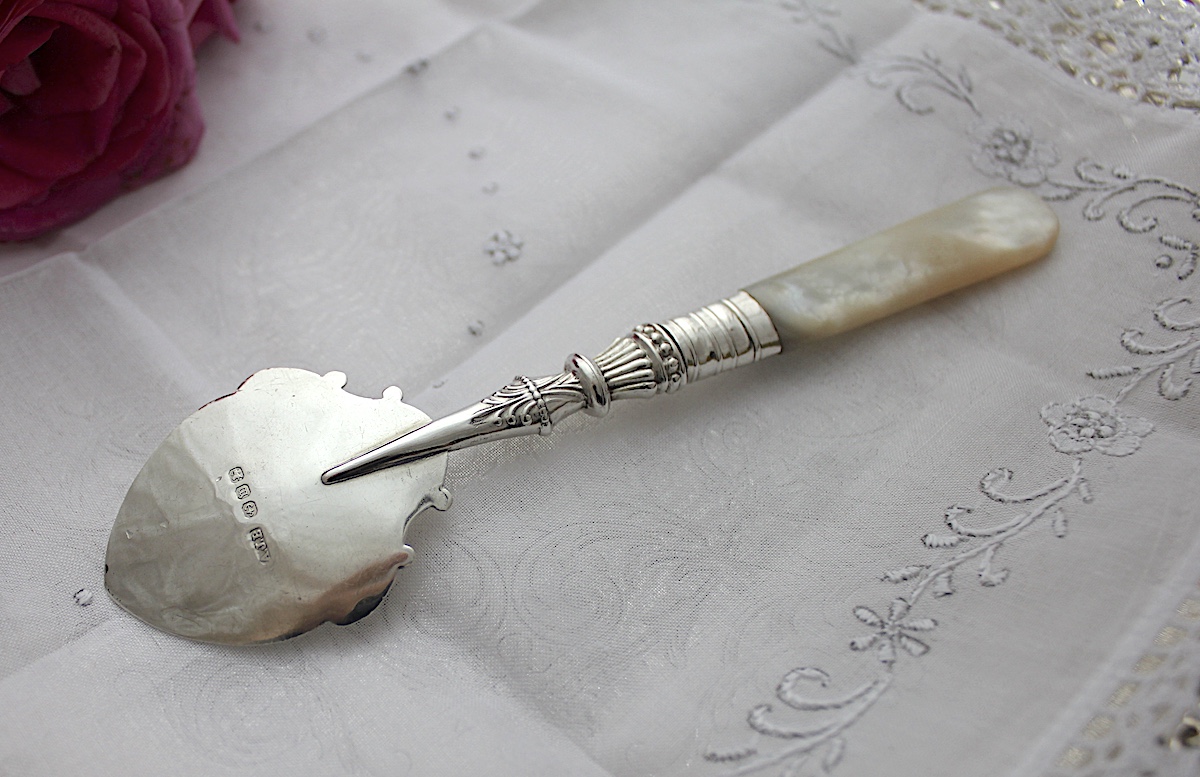 Sold : 優美なデザイン、花柄の白蝶貝ジャムスプーン1896年 ¥