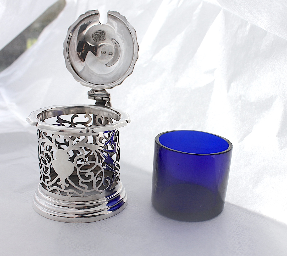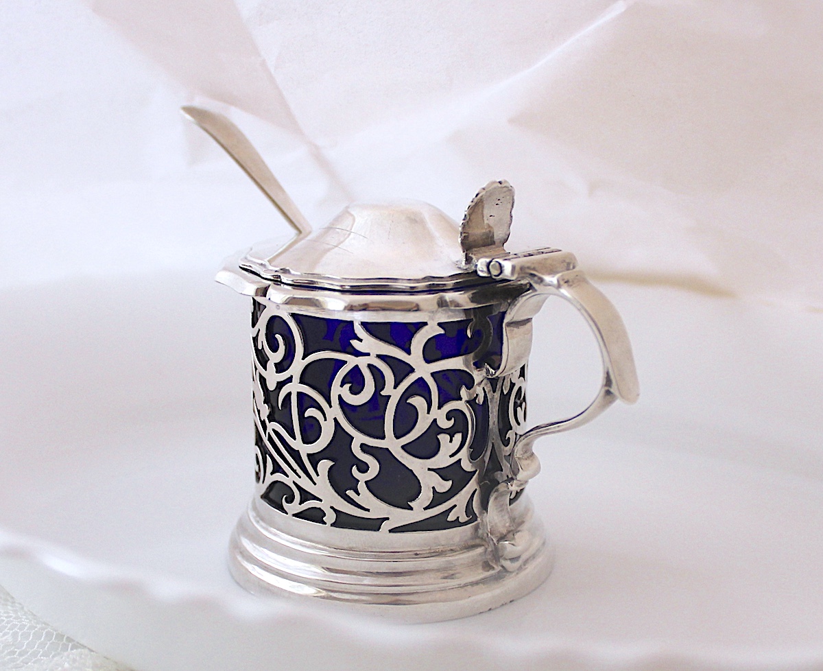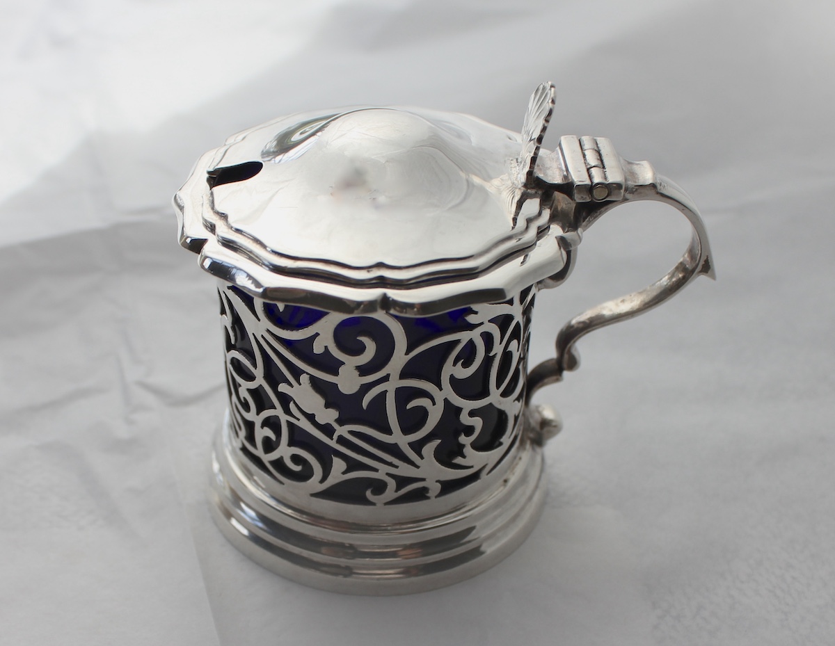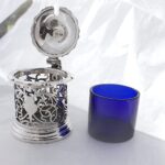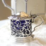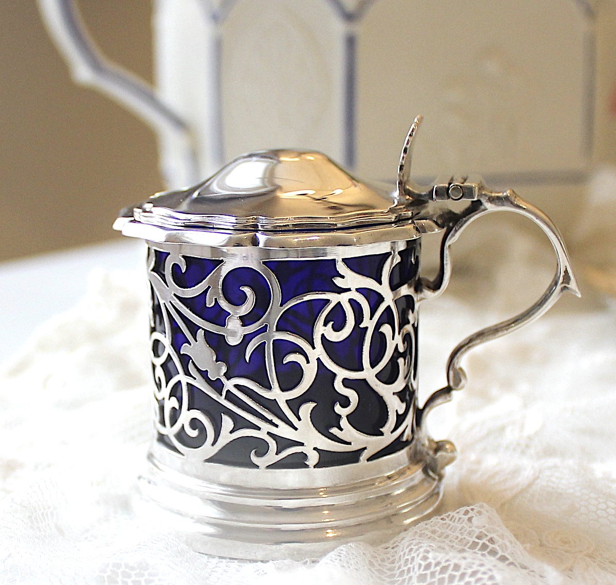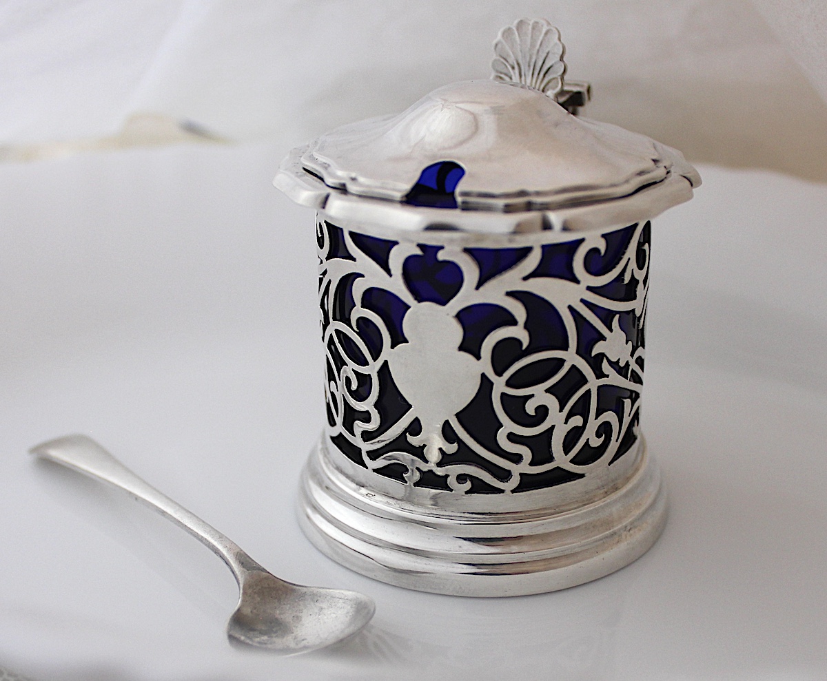 小ぶりながら、精緻なピアス細工が施されたガラスケース付きのマスタード入れです。マスタード入れ、というアイテムではありますが、それにこだわらず、塩やスパイス、ネギ、生姜、あるいはティータイムのお砂糖やミニサイズのジャム入れ、蜂蜜など、もう、なんにでも使ってちょうだい、な、優秀万能アイテムです。今回は、同じくスターリングシルバー製の小さなスプーンもおつけします。青ガラスに、ヒビ、カケなどはありません