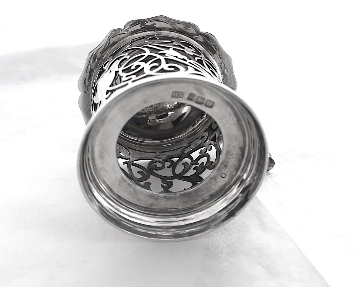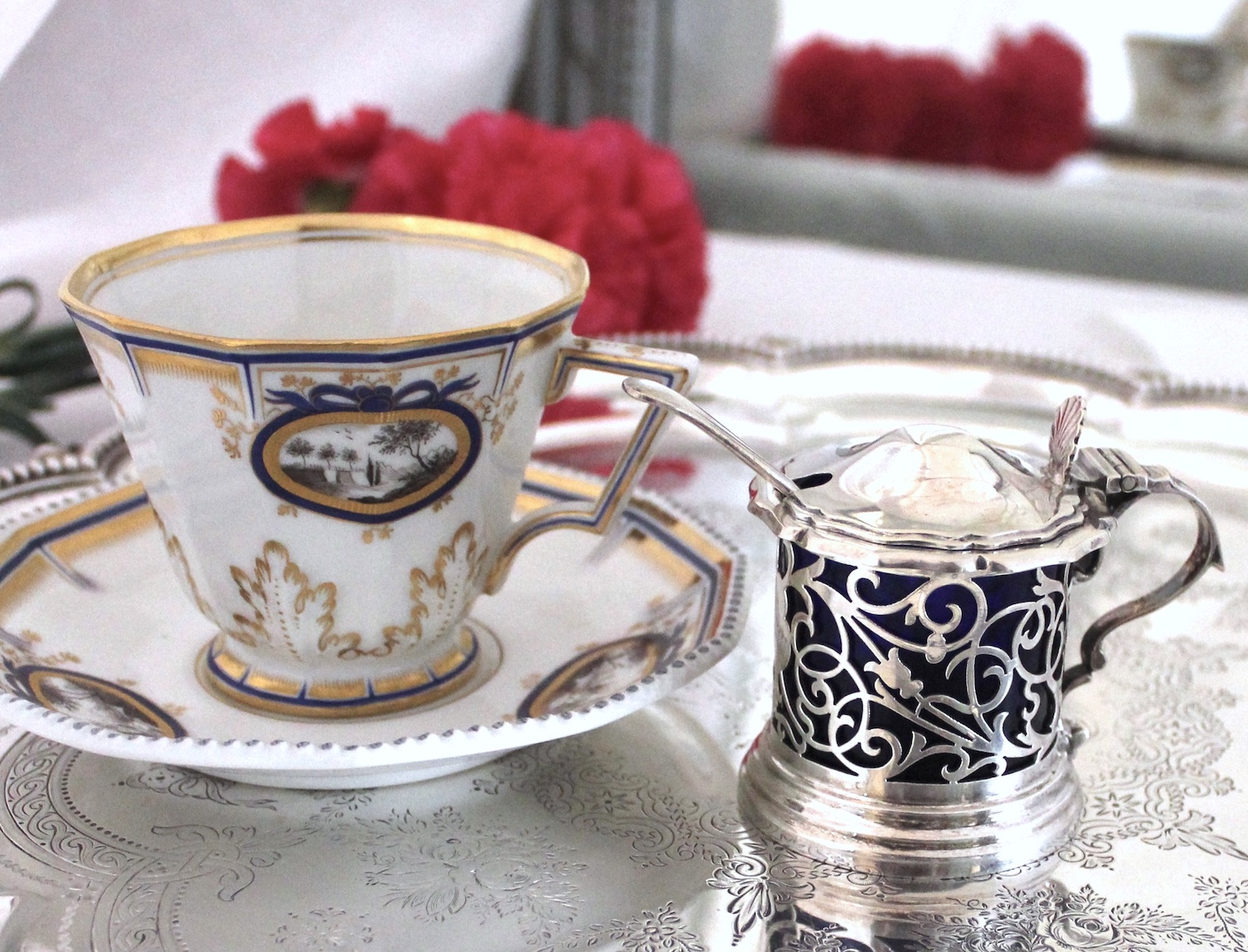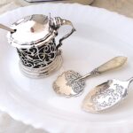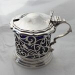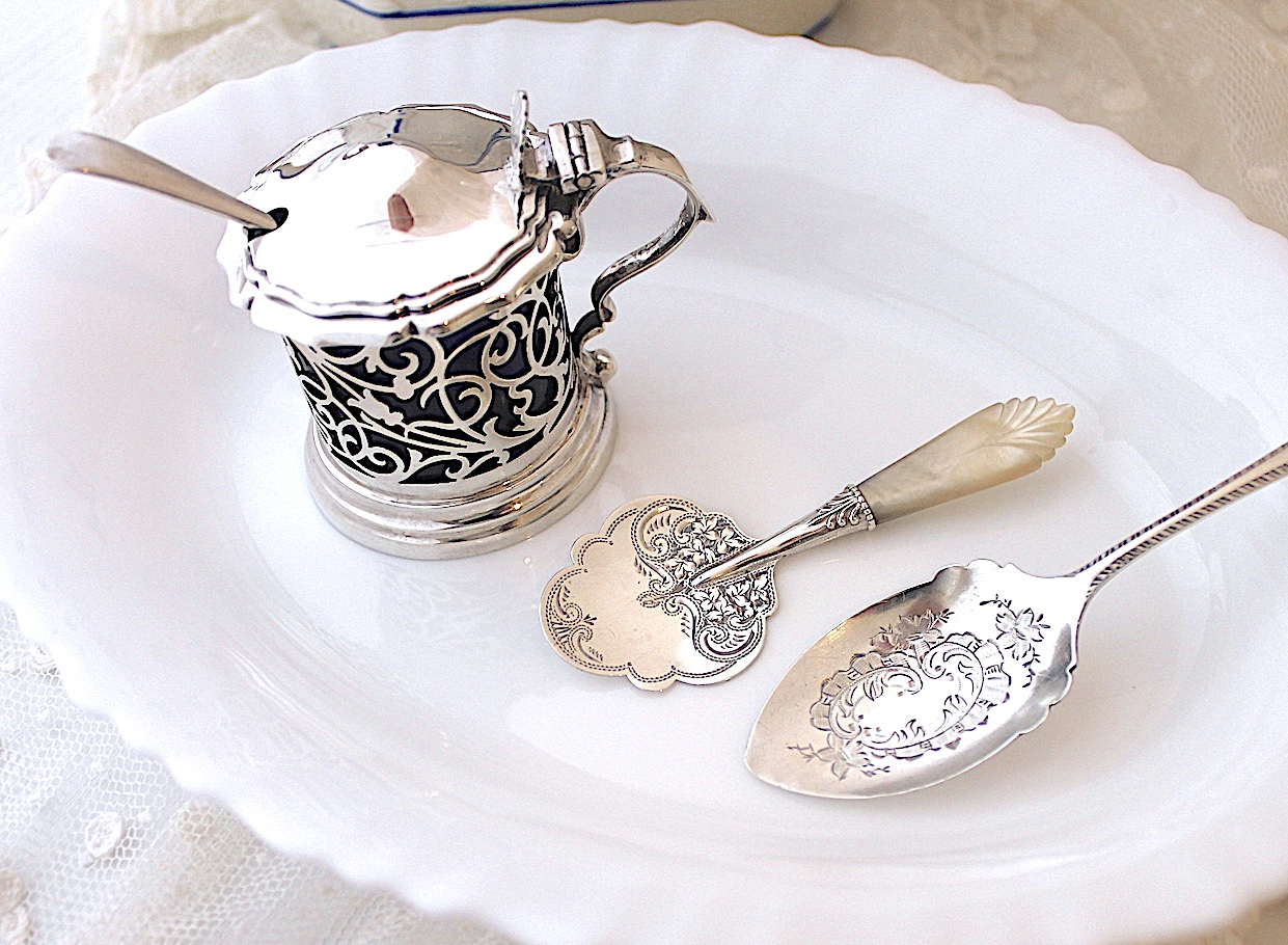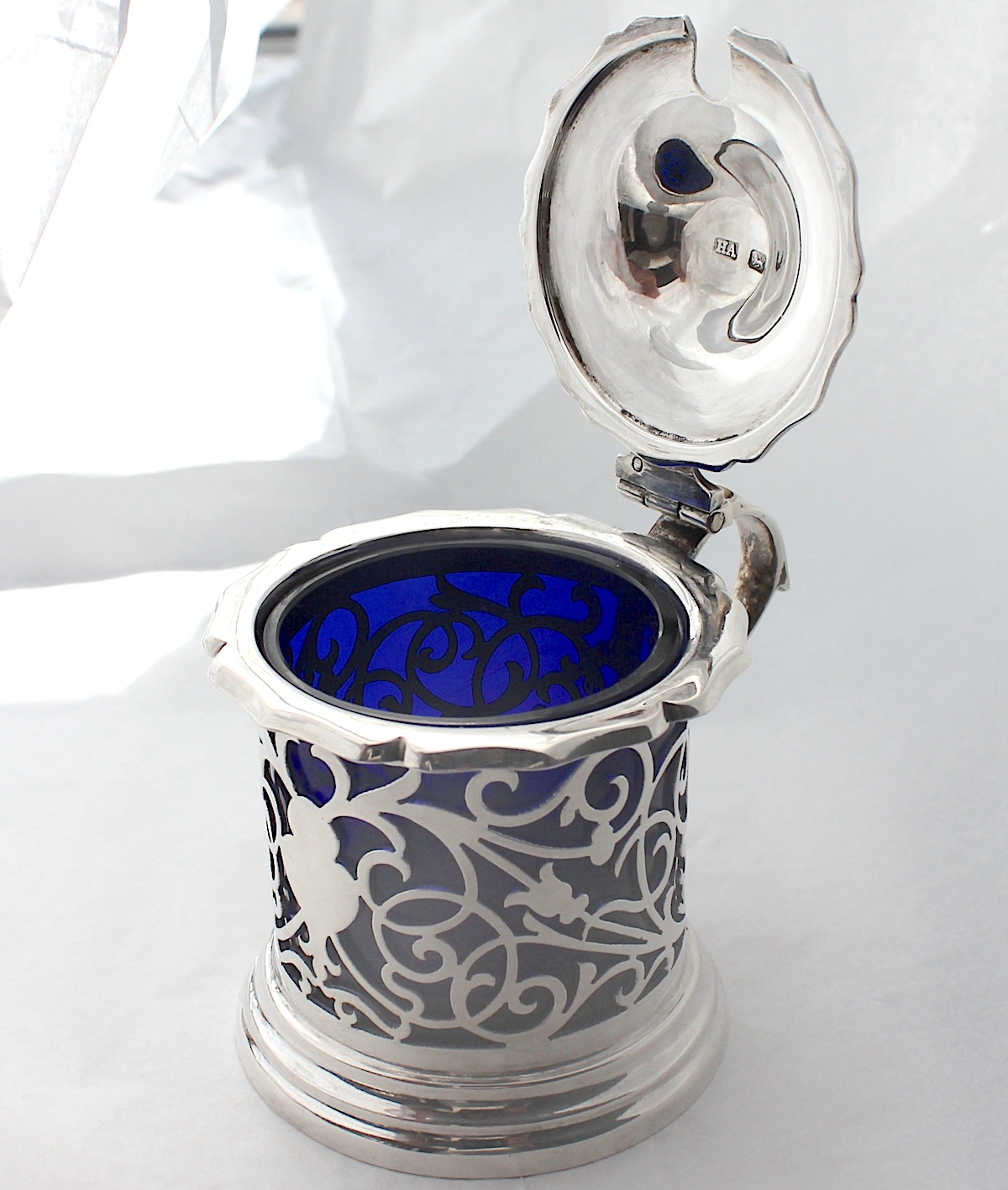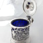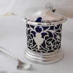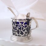 小ぶりながら、精緻なピアス細工が施されたガラスケース付きのマスタード入れです。マスタード入れ、というアイテムではありますが、それにこだわらず、塩やスパイス、ネギ、生姜、あるいはティータイムのお砂糖やミニサイズのジャム入れ、蜂蜜など、もう、なんにでも使ってちょうだい、な、優秀万能アイテムです。今回は、同じくスターリングシルバー製の小さなスプーンもおつけします。青ガラスに、ヒビ、カケなどはありません
