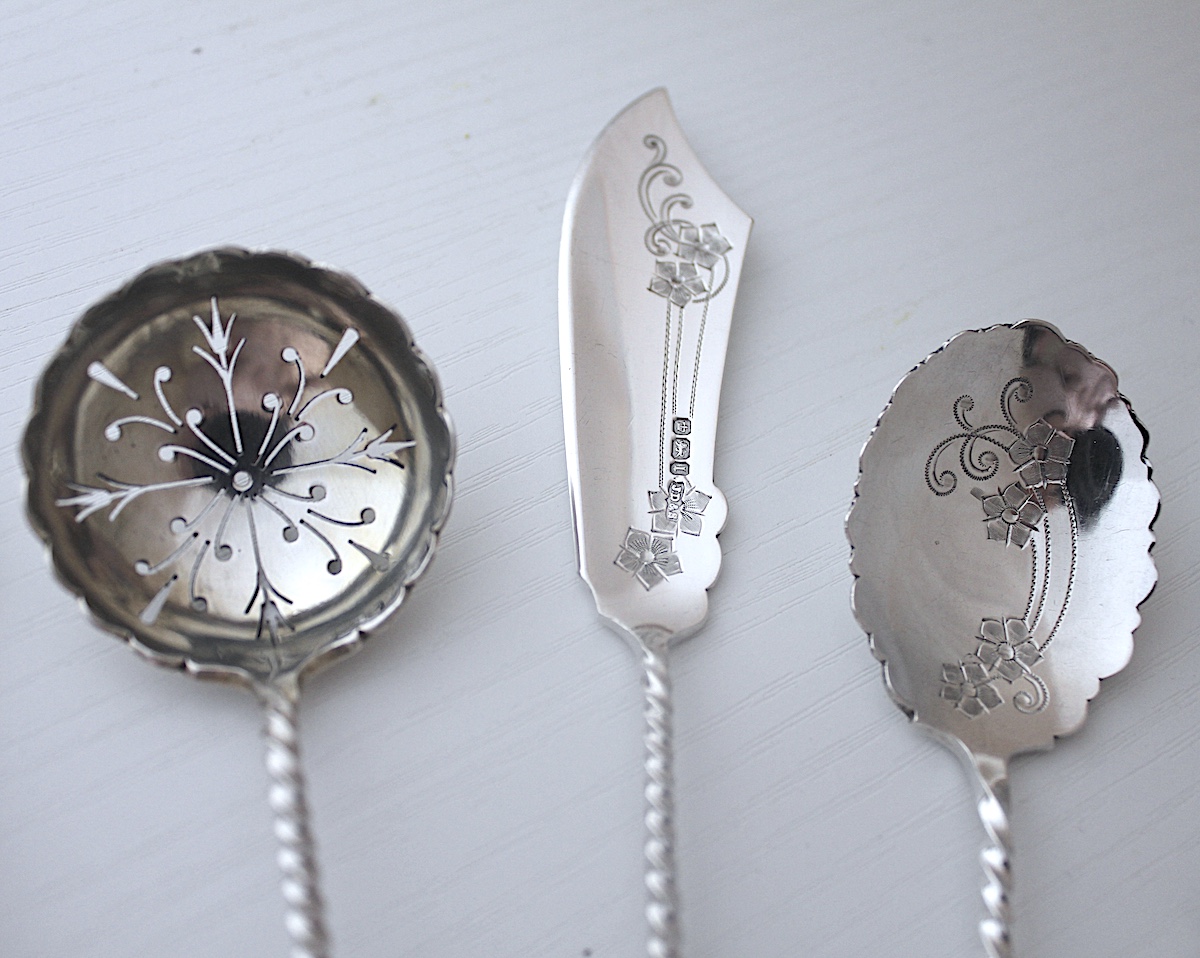 ジャムスプーン長さ14cm重さ20g最大幅3.5cm、バターナイフ長さ17cm重さ23g最大幅2.2cm、シュガーシフター長さ13.8cm重さ25g最大幅4.0cm