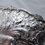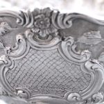 打ち出しで、植物文様の凹凸を作り、そこにチェイシングという細かな模様をつける技法で、花々を美しく表現しています。