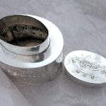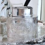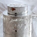 ジャーマンシルバー、可愛らしい装飾がされた使いやすいティーキャディです。蓋の密閉度が高く、直接茶葉を入れてもお使いいただけるかと思います。