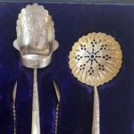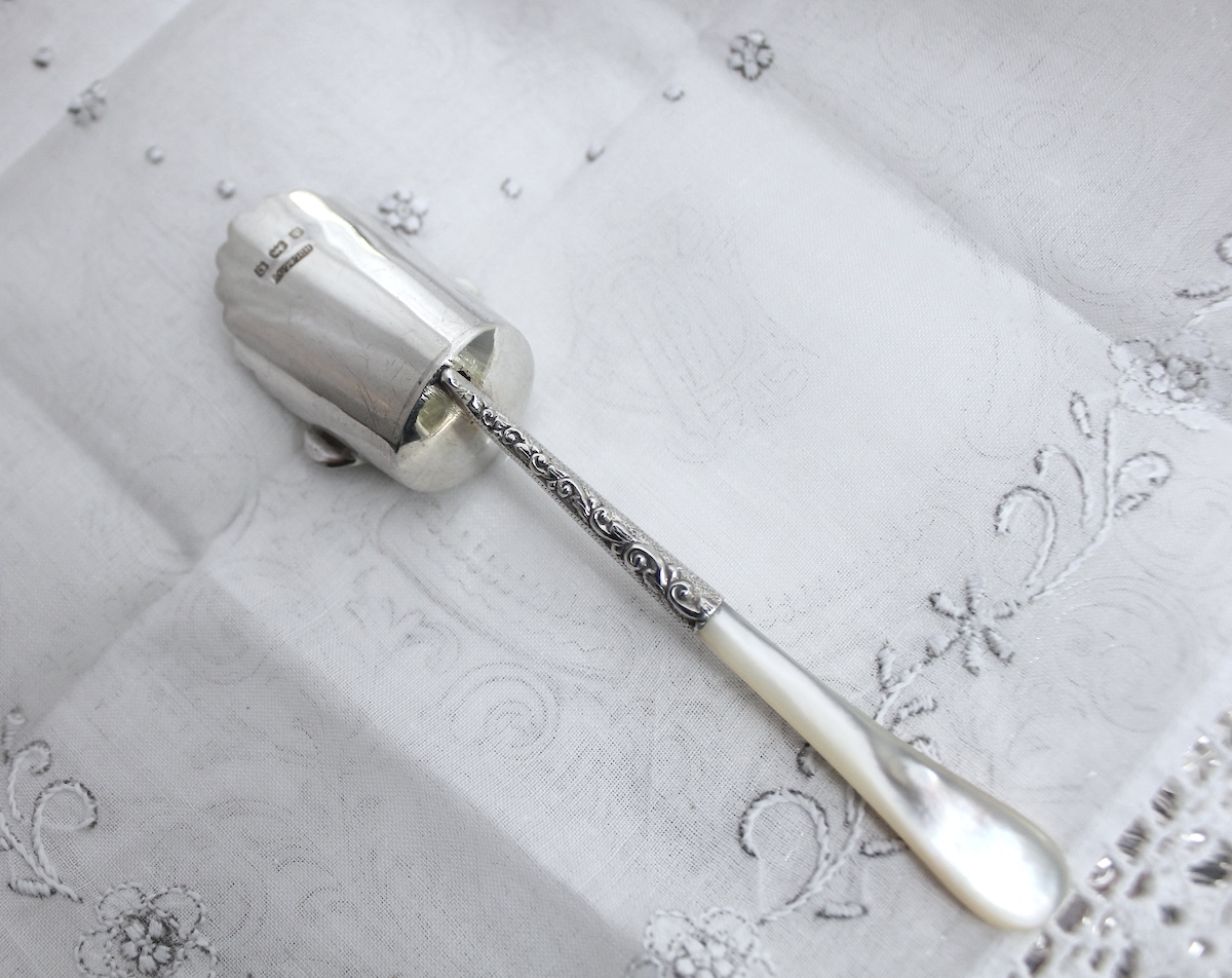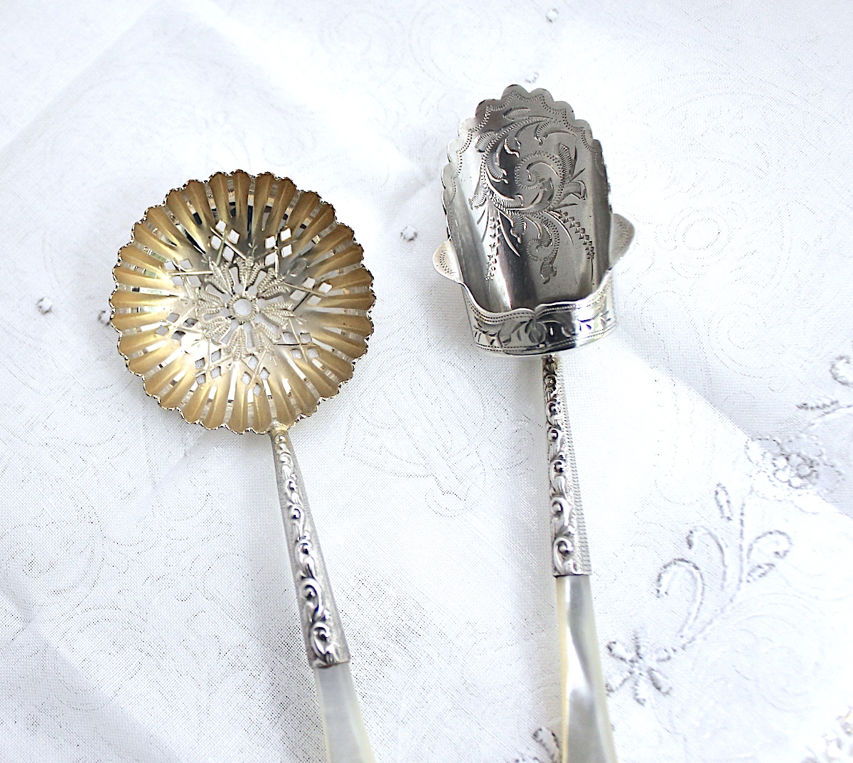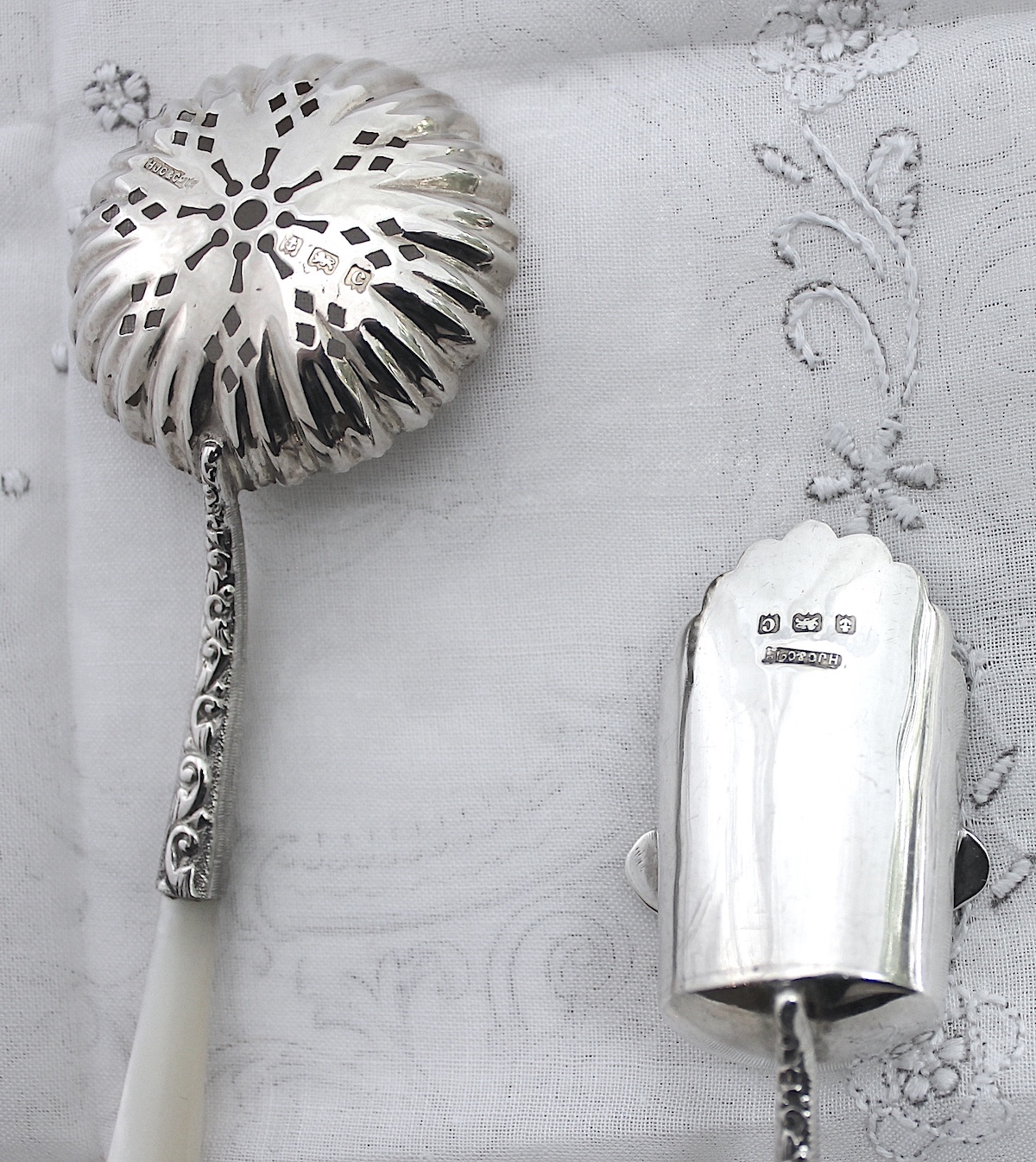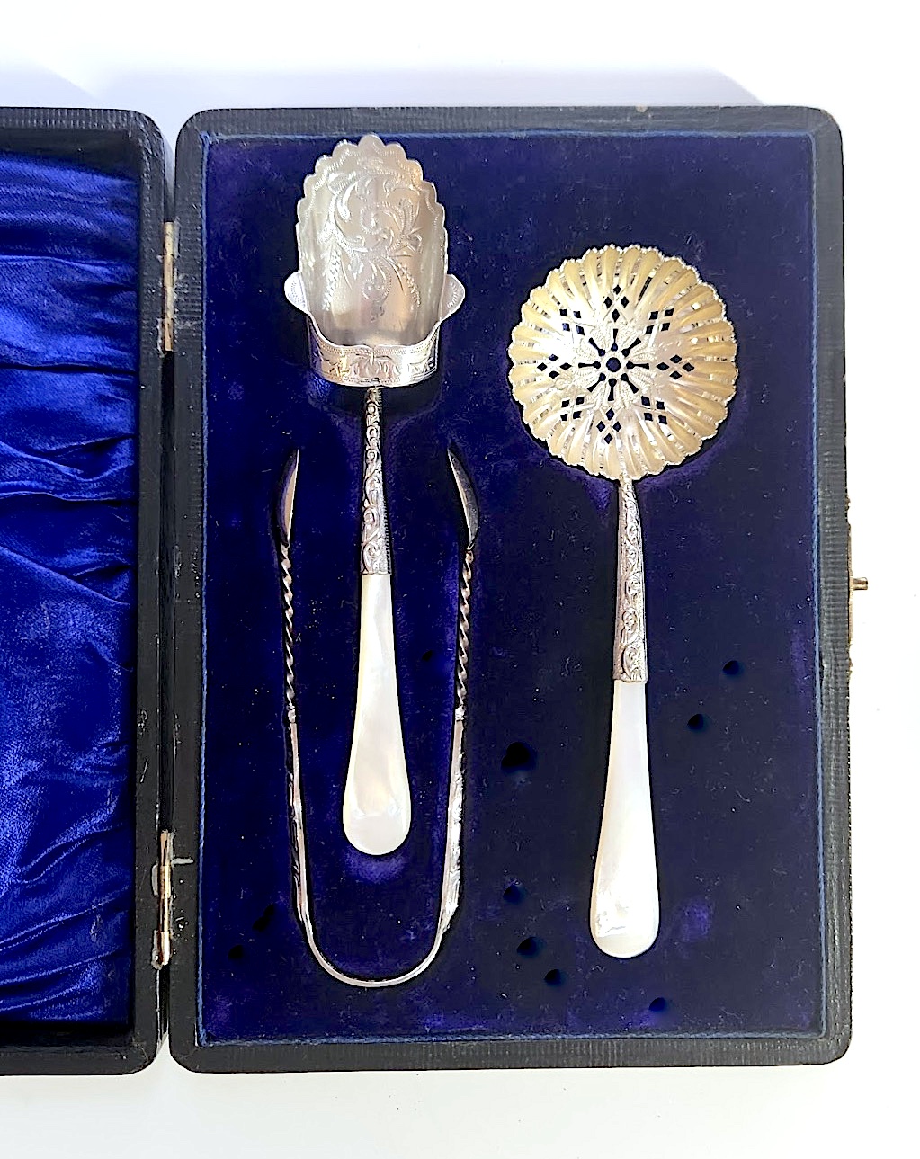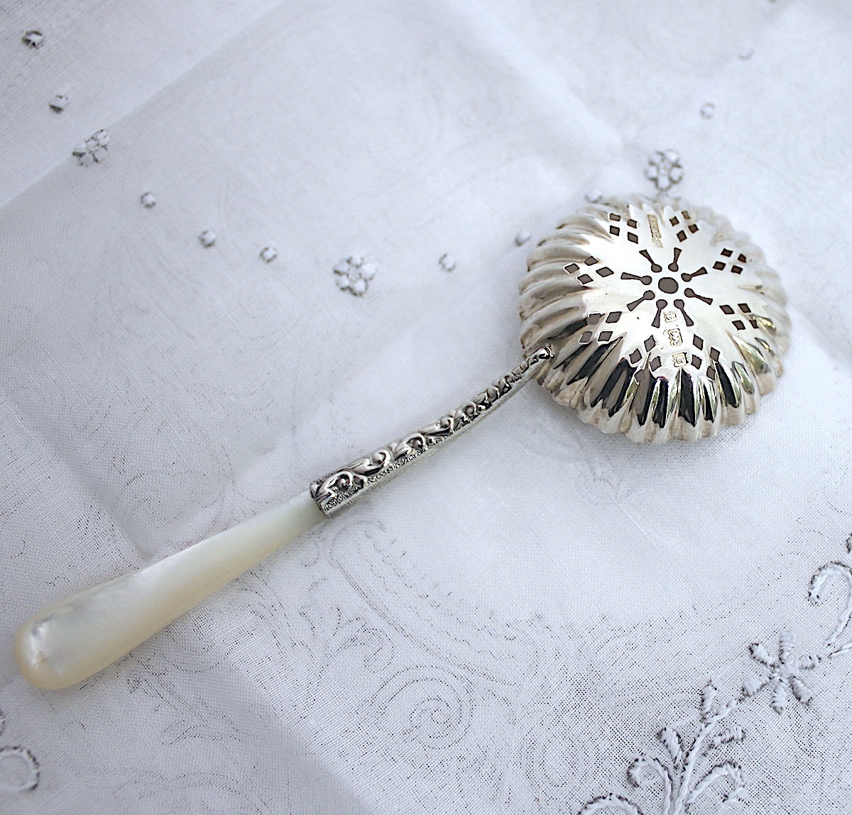 今から120年ほど前に作られた白蝶貝ハンドルのスコップ型キャディスプーンと、シュガーシフタースプーンの素敵なセットです。キングスパターンのシュガートングもセットされていて、3点とも、年代、メーカー、産地と、全てのホールマークが一致しています。そして3点とも全てのアイテムはなぜか全部13gで一致しています。最初からこのように計画、デザインされた貴重なセットですね。白蝶貝、小さなものですが、大変輝きが美しく、上質なものが使われていることがわかります。