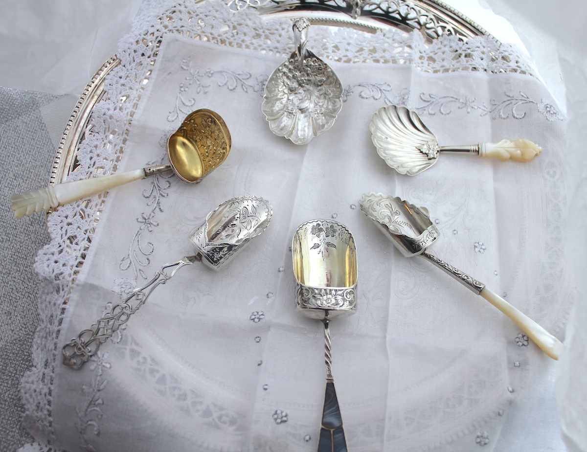 ティータイムに合わせて、このキャディスプーンで、茶葉を入れ、トングで砂糖をつまみ、シフタースプーンで、ちょっと酸っぱいフルーツにお砂糖を振りかける、という一連の作業を、このセットの通りにやってみたくなりますね。