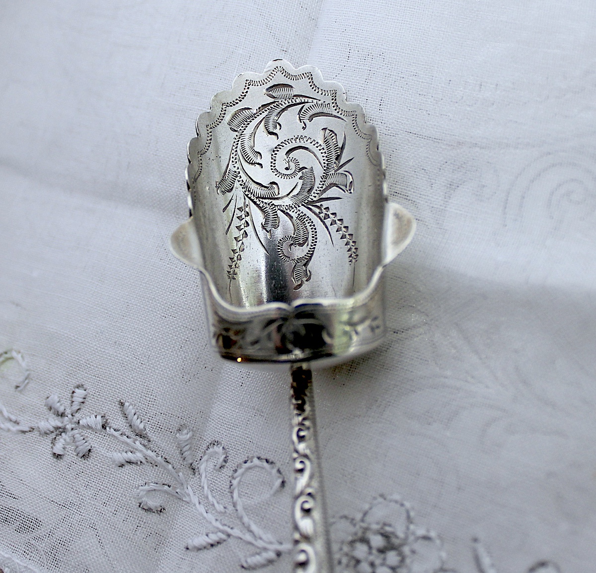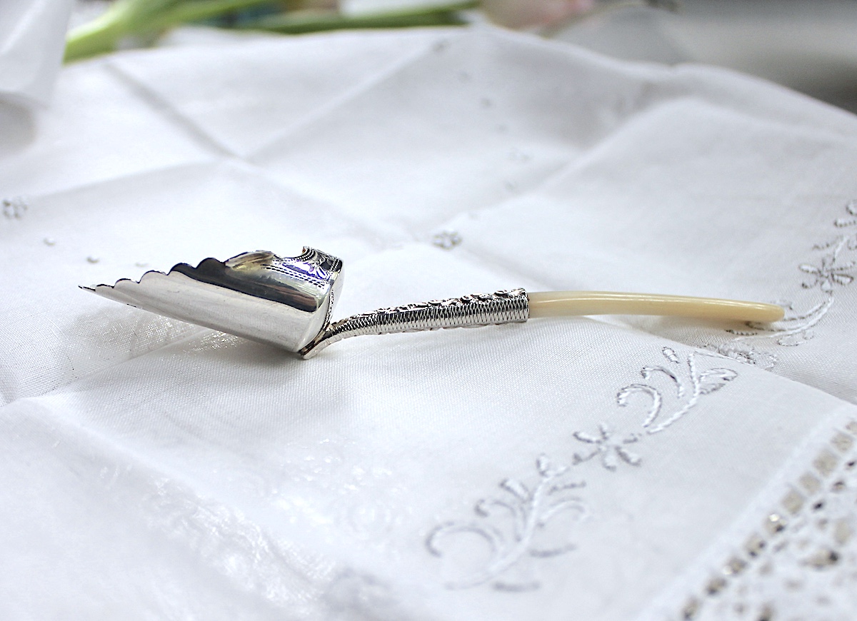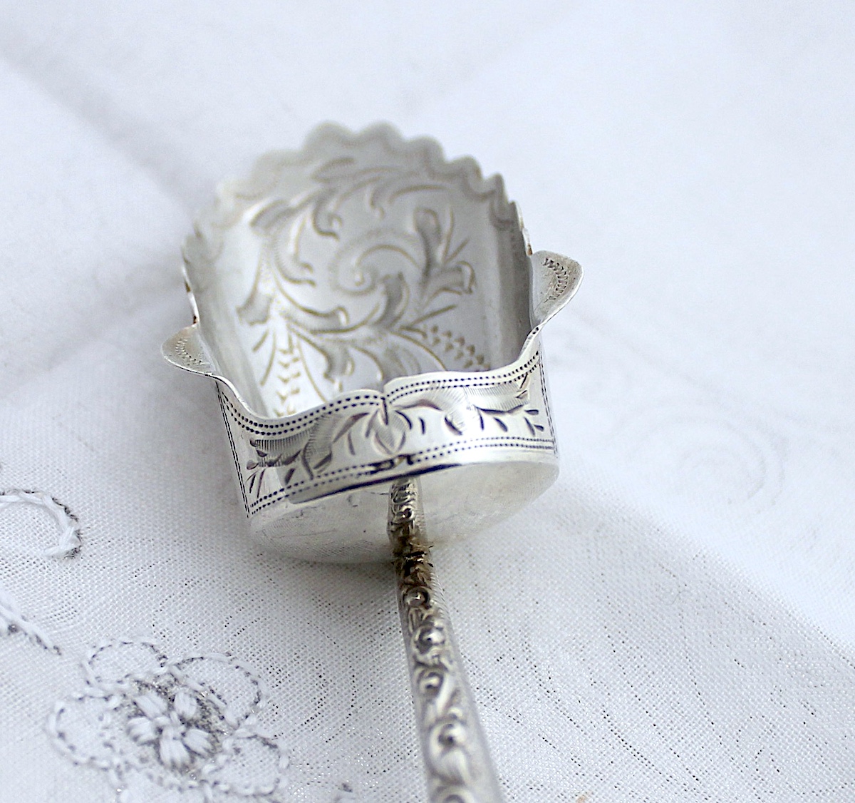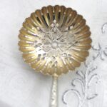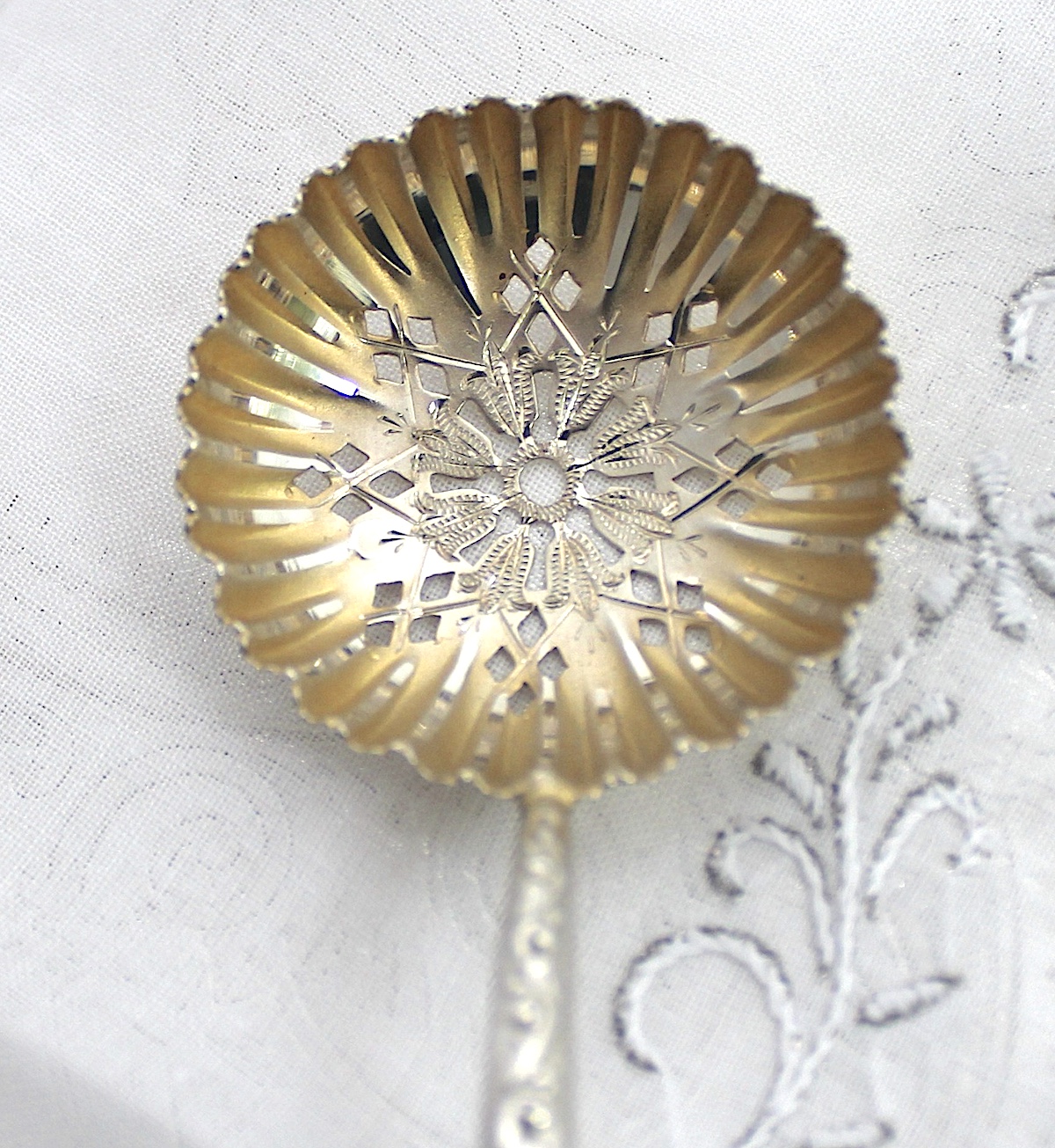 まだ当時は、今のように果物の種類も豊富でなく、酸味の強いものが多かった為、そしてお砂糖自体も貴重なものだったために、このような、砂糖を振りかけるためだけのスプーンも生まれました。現在では、このサイズでしたら、茶葉を掬うキャディスプーンとしてお使いになっても楽しいと思います。