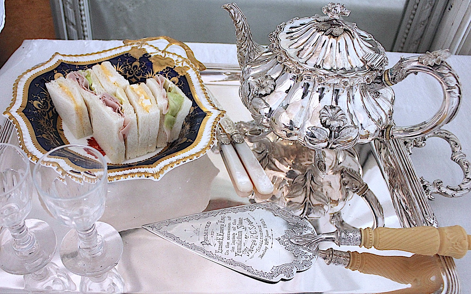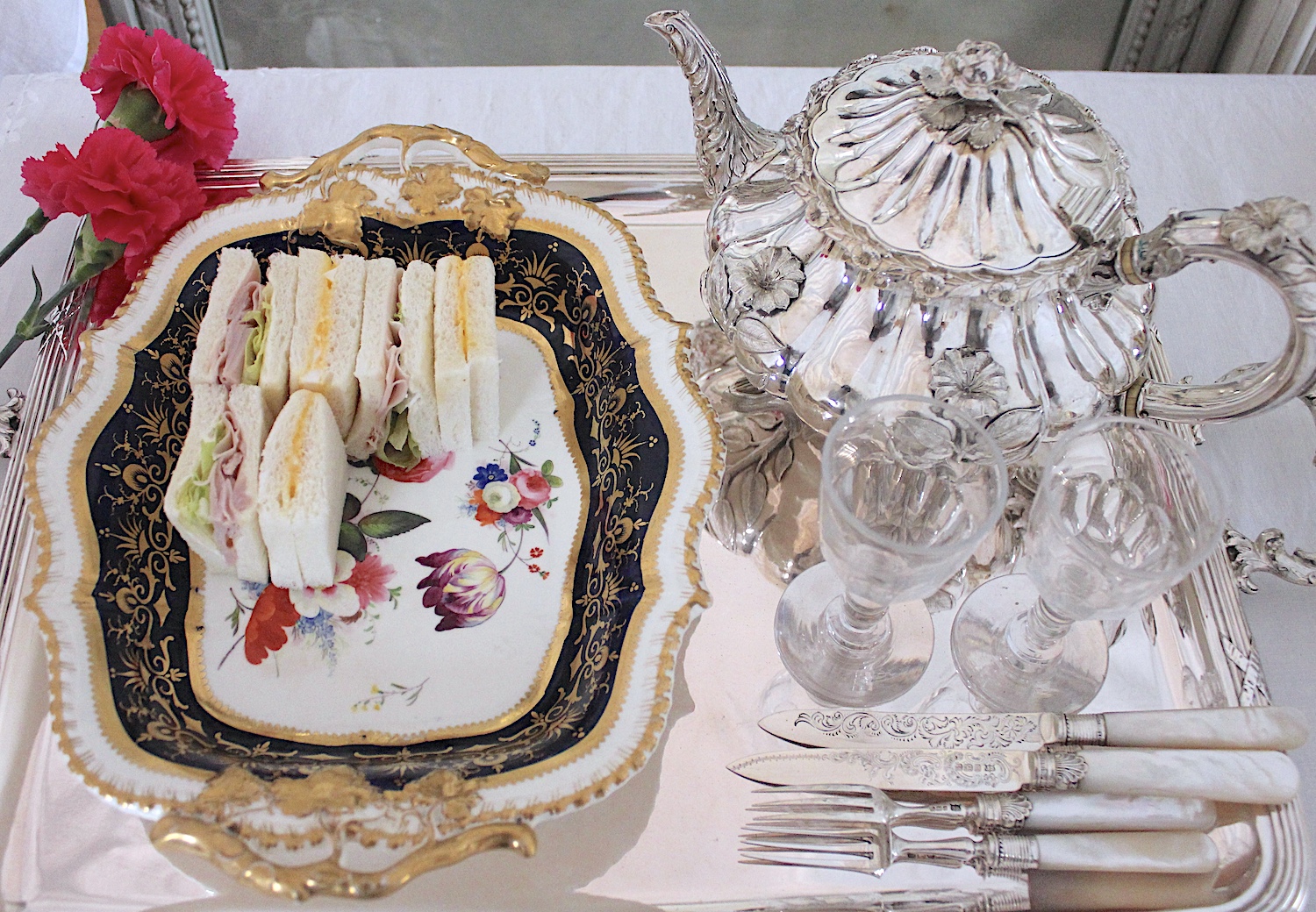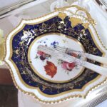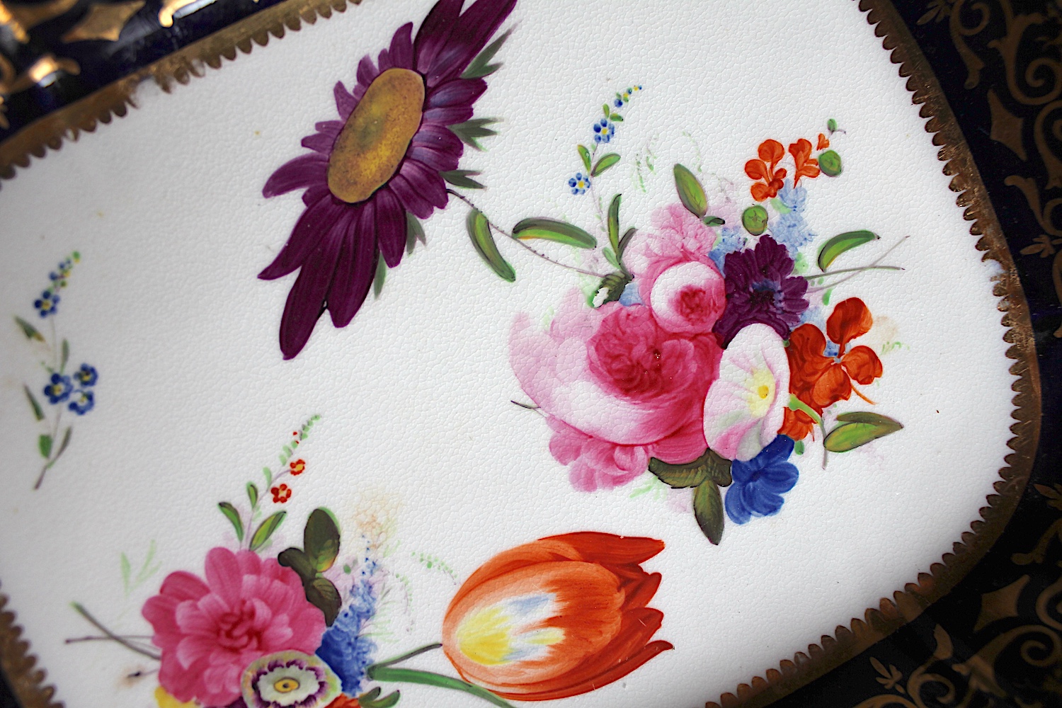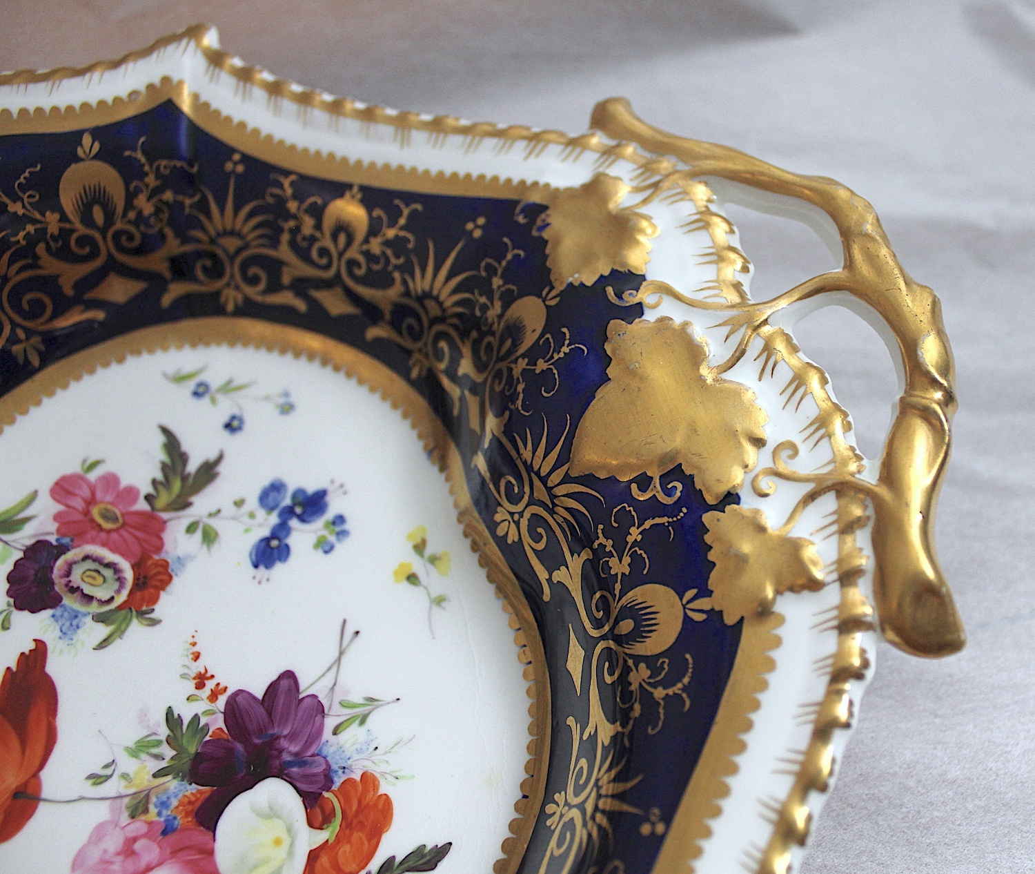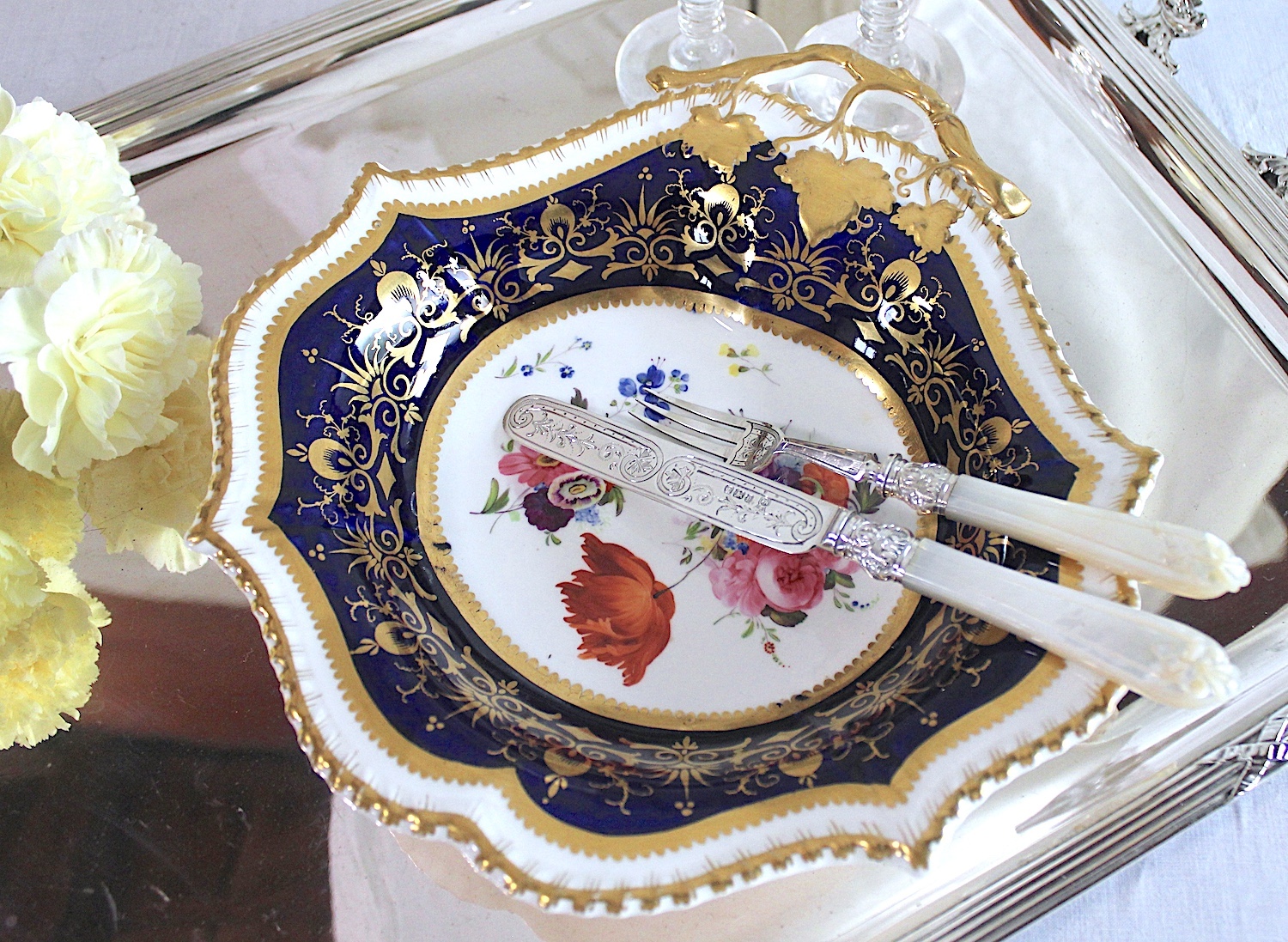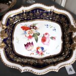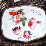 美しい花の絵に、両手ハンドルがついた、大きめのプレートです。サンドイッチやカナッペ、おつまみなどに重宝するアイテムです