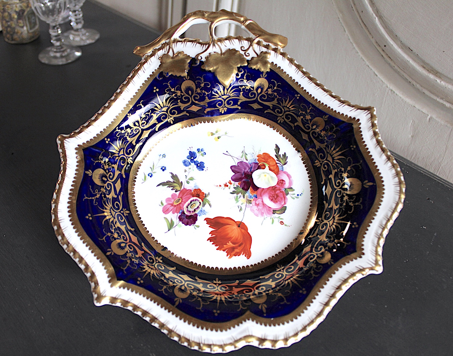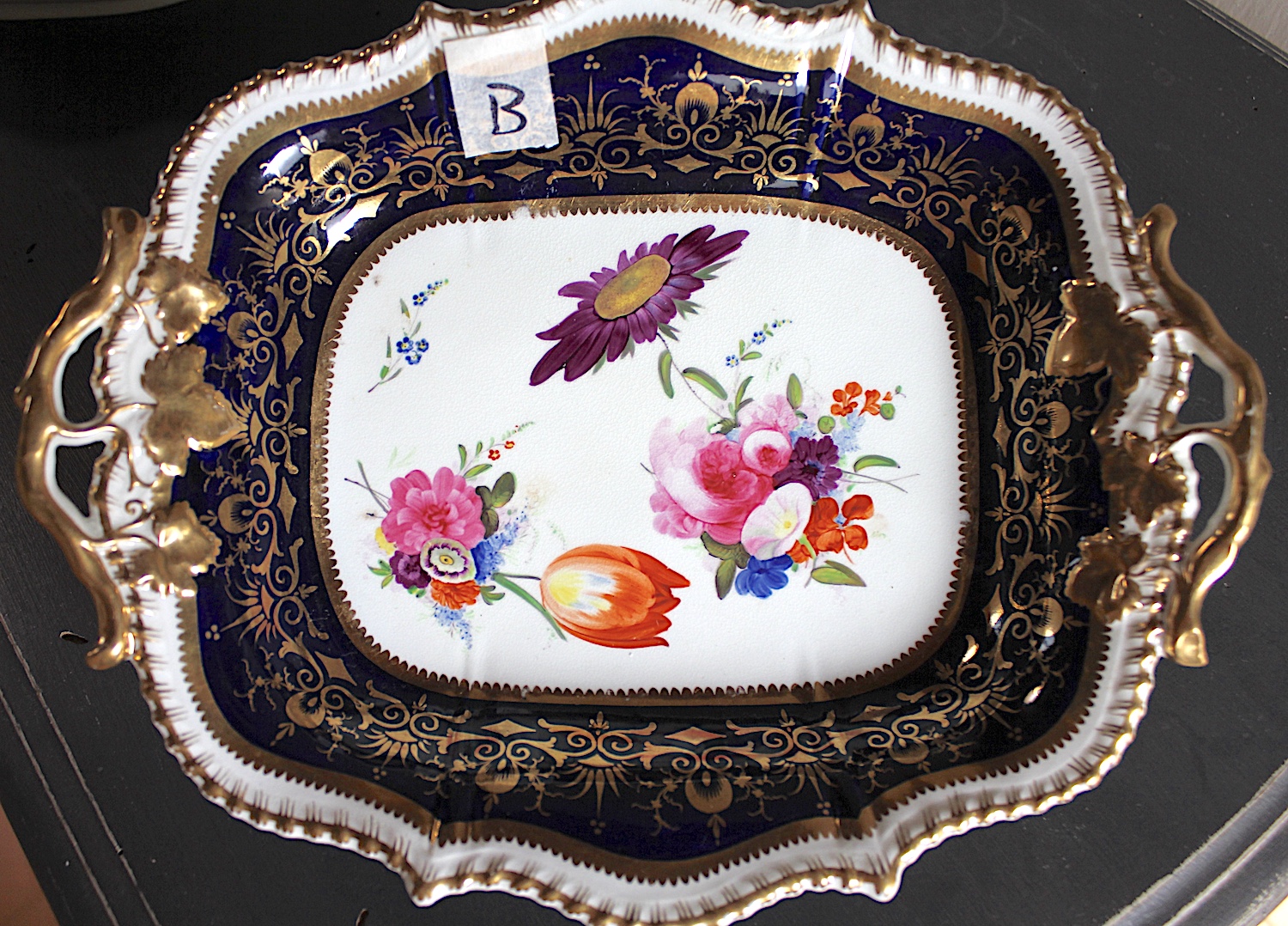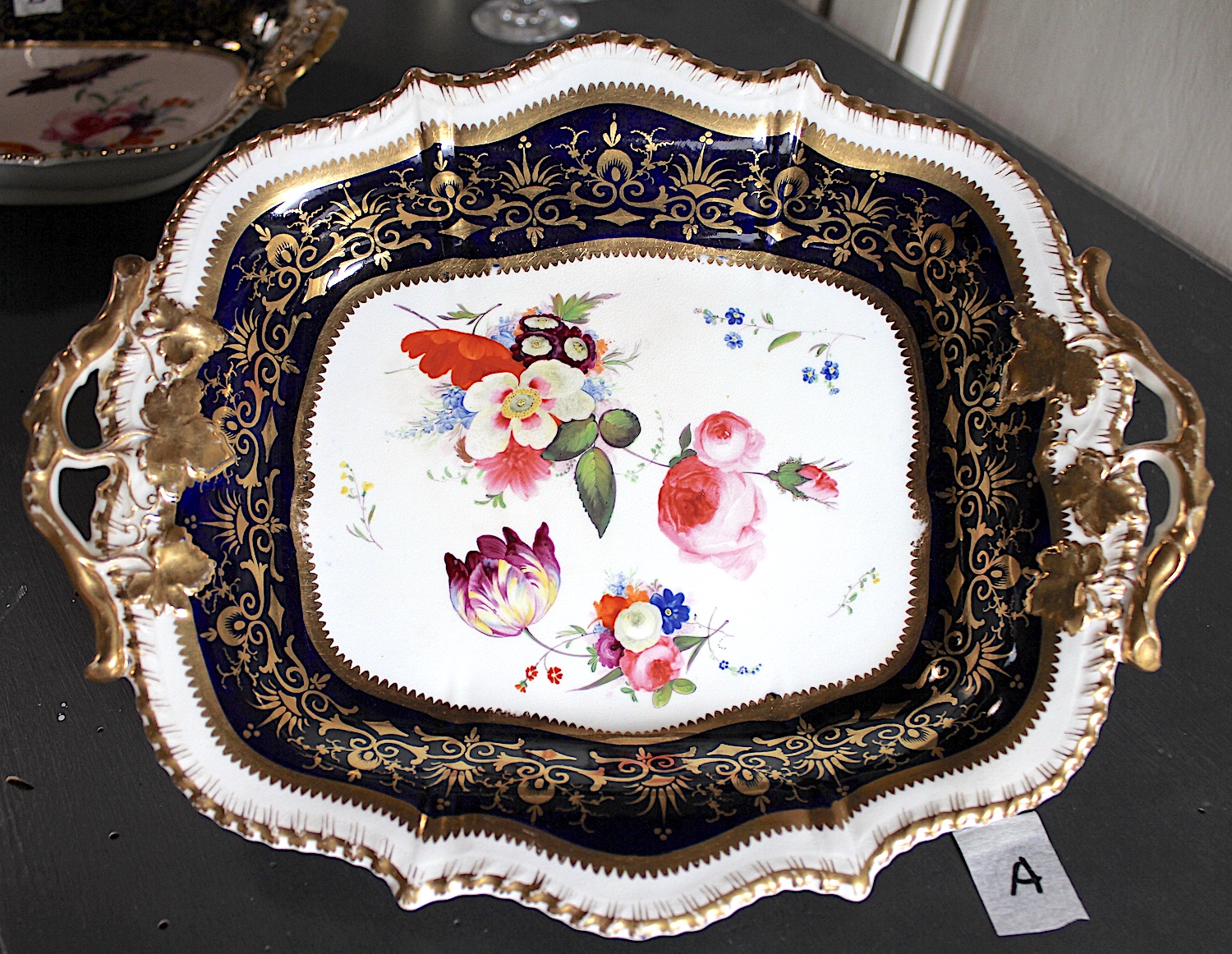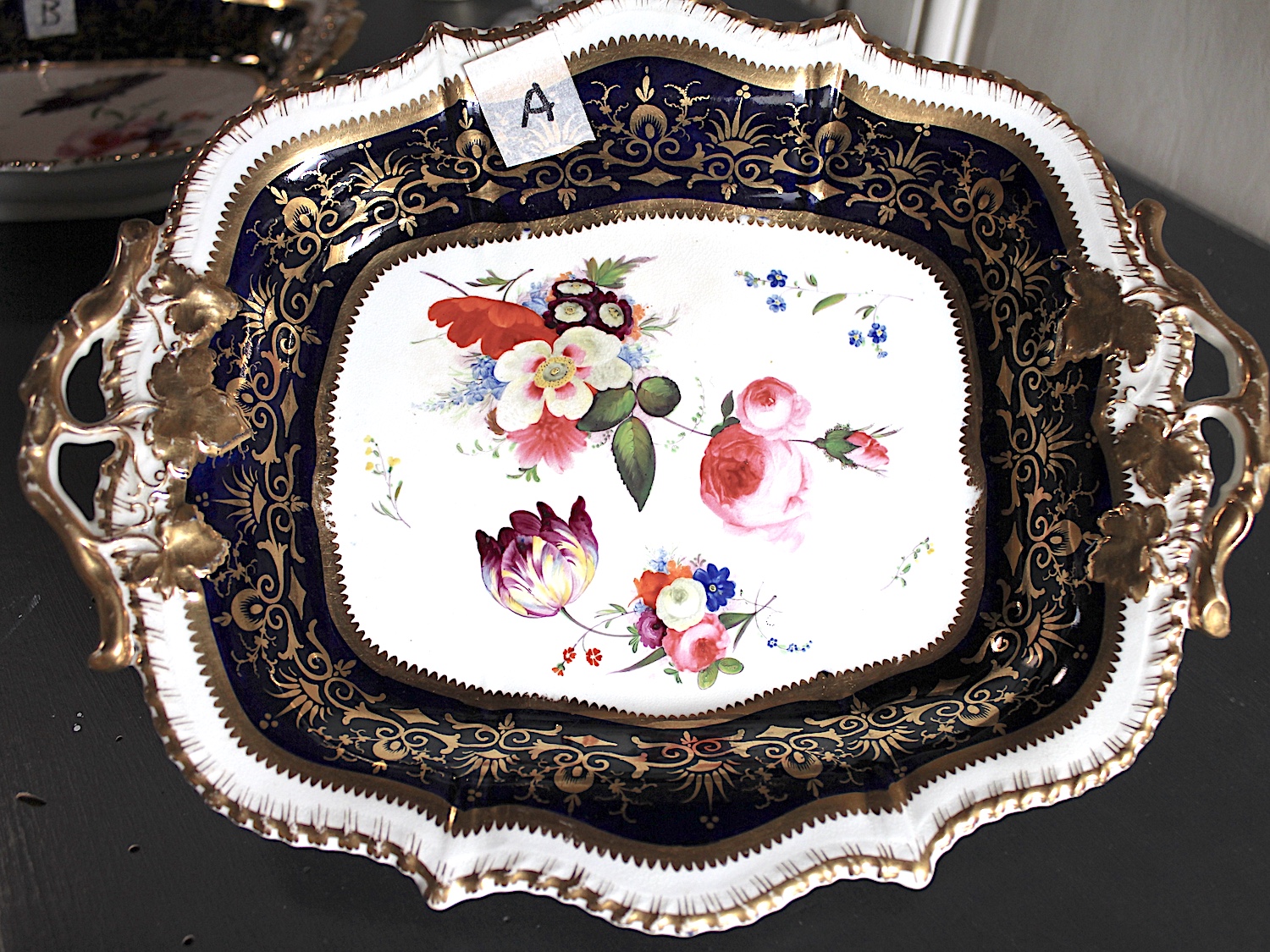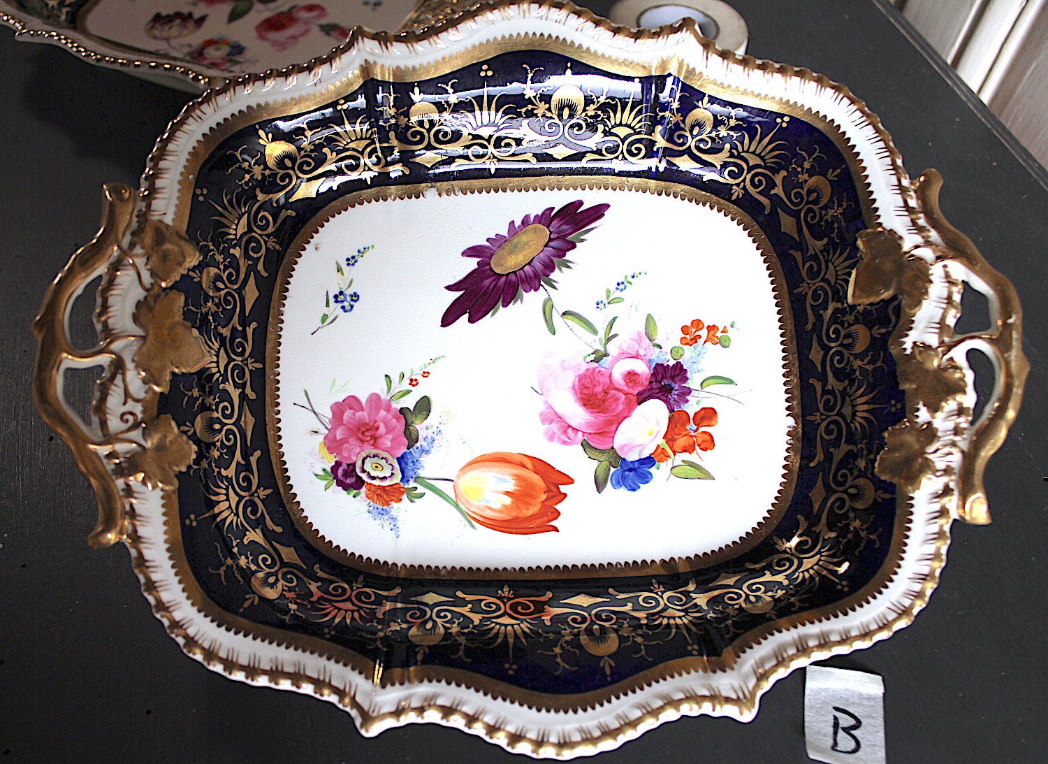 美しい花の絵に、両手ハンドルがついた、大きめプレート。Aと同じサイズですが、惜しいことにヘアラインが入っています