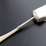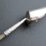 全体にとてもきれいな、白蝶貝のキャディスプーンですが、惜しいことに、ハンドルの付け根部分にリペアがあります。