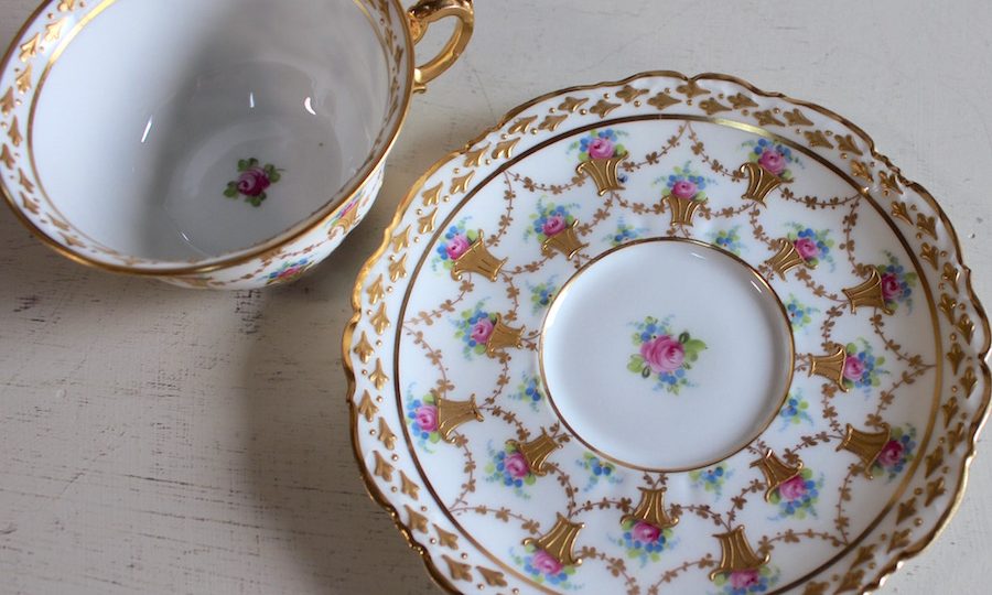 ドレスデンの、金彩を生かしたおしゃれなカップアンドソーサー。小さな金のバスケットが盛り上げられ、ハンドペイントの小さなバラが散らされています。カップの形も、底部分が花びら型にカットされ、とてもキュートなデザインです。