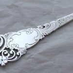 両面にエングレーヴィング装飾が施された、ピアスが美しいブレッドフォークです。現在ではほとんど使われる事はありませんが、ビクトリア時代は小さく切ったパンを、このフォークに突き刺して火で炙って食べる、ということが行われていました。まだトースターがなかった頃の話ですね。