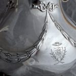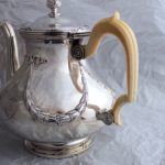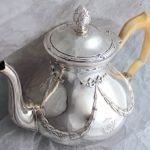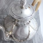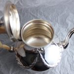 愛らしいリボン装飾の、シンプルで洗練された雰囲気のティーポットです。フランス製、ファーストミネルバ、950銀となります。