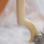 象牙にはヘアラインといって、表面だけのヒビっぽいものがよく見られますが、このお品のハンドル下部に、0.5mm程度のすき間(ヒビ)がありました。
