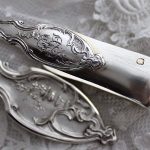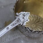 シフタースプーンのハンドル、シュガートング、いずれも、植物が装飾された鋳造製、ずしりとした重さがあります。持ち主のものであったらしいデザインされたイニシャル、シフタースプーンに開けられた小さな穴のデザインもおもしろく、フランスらしくて素敵ですね。