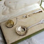 フレンチシルバーの素敵な3点セットで、シュガーシフター、茶こし、砂糖つまみが箱に収められています。