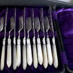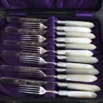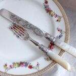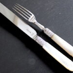 デザートセットは、通常のディナーセットとは別に、このように異素材を用いたおしゃれなデザインで誂えたものが多く、食事の締めくくりにふさわしい華やかなカトラリーとなっています。白蝶貝ハンドルのデザートセットを探していらした方にお勧めします。