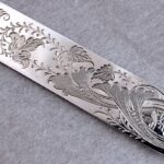 ナイフのブレードは、チェイシングではなく、エングレーヴィングで勢いよく彫ったデザインです。角度を変えるたびキラキラします。