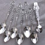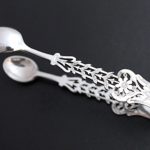 今回もひとつ一つ、糸鋸できりぬいていく作業によって、美しいデザインのスプーンが生み出されしており、全く見飽きることがありません。ピアスで切り抜き、さらに花びらや葉の部分に葉脈や雄しべなどをエングレービング(彫刻)で装飾した大変凝ったものです。