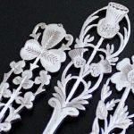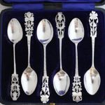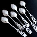 デザインの異なるティースプーン6本セット。英国ロンドン製1913年Barnard Familyによるもので、イングランドのバラ(チューダーローズと呼ばれる一重のバラ)、スコットランドのアザミ、アイルランドのシャムロック(三つ葉の総称で、通常はクローバー)と、国花である3種の花を揃えて英国を象徴するデザインとなっています。