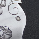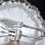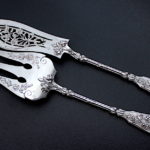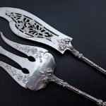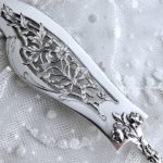 フレンチシルバーの老舗Henin & Cieのリボン模様による、サーバーセットです。ファーストミネルバの刻印がありますので、銀純度は950です。
