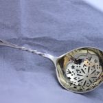 シフタースプーンは、酸味の強い果物、イチゴや柑橘類などを食する際に、シュガーをかけるために使いました。ピアスが美しいので、コレクターズアイテムとしても人気となっています。