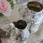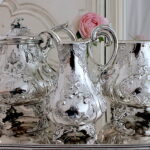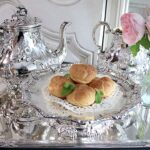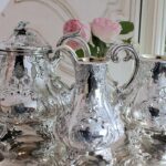 (*最後の画像、ティーセットを乗せたスクエアトレイは、ベルギーシルバー製5点ティーセットの一部です。